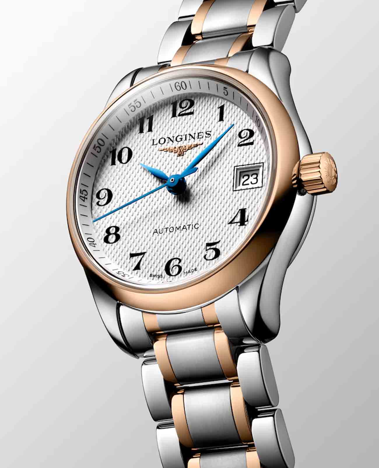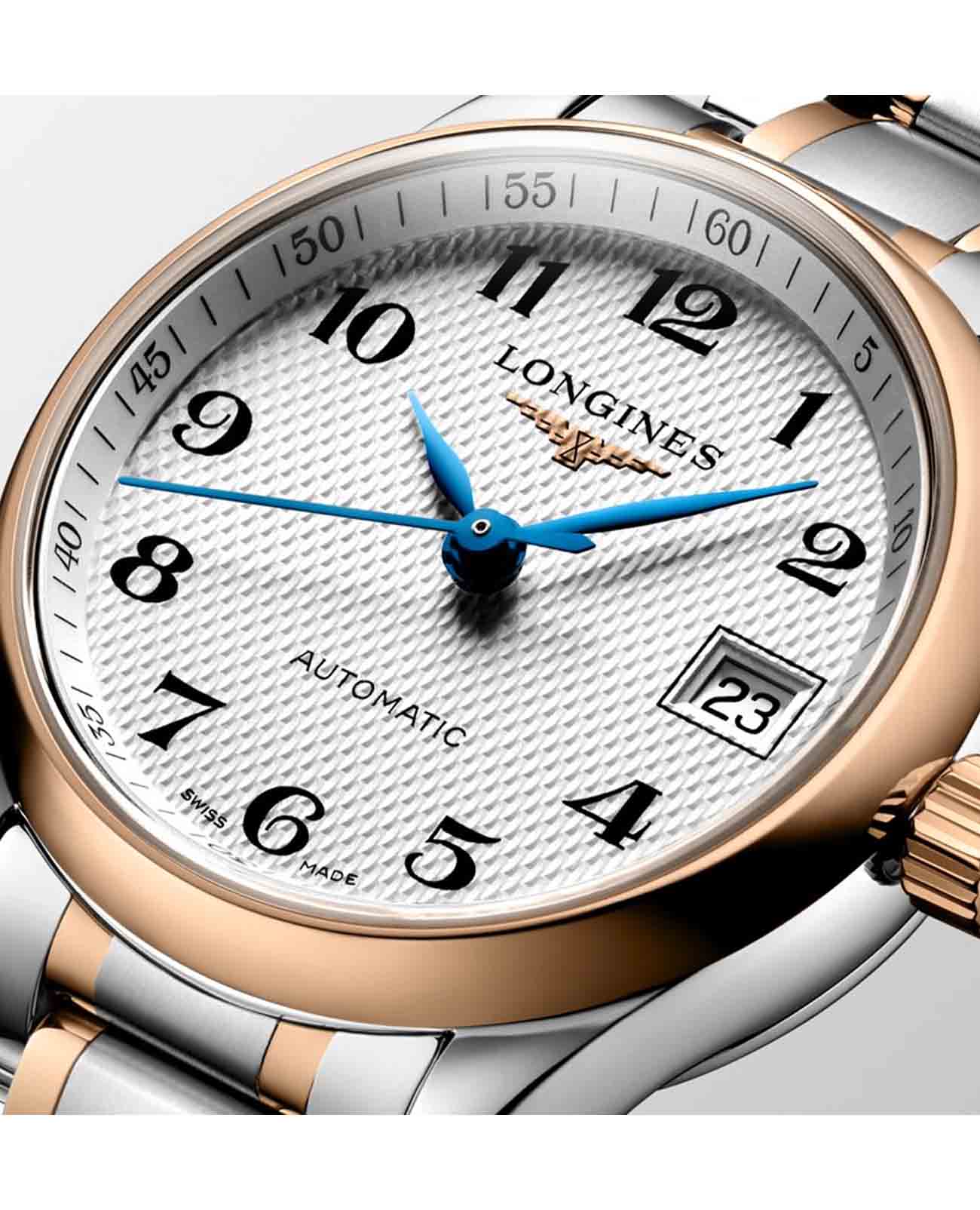 Автоматические женские двухцветные часы Longines Master Collection L2.128.5.79.7. Сапфировое стеклоСапфировое стеклоПрочный и надёжный материал из кристалла сапфира синтетического происхождения, характеризующийся особой твёрдостью и устойчивостью к царапинам и повреждениям. устойчивое к мелким механическим повреждениям. Коллекция Longines Master Collection сочетает в себе классическую элегантность и превосходное качество, которые не перестают радовать тех, кто ценит исключительные часы. Корпус из нержавеющей стали. БезельБезельВнешний ободок, закрепляющий стекло. В спортивных часах так называется поворотное кольцо с делениями на циферблате, выполняет роль таймера – замеряет отрезки времени на шкале. Неподвижный безель – элемент декора. Однонаправленно вращающийся безель на дайверских часах позволяет фиксировать моменты погружения и выныривания на поверхность. из 18-каратного золота18-каратное золотоОбозначение по каратной системе пробирования, оно показывает, сколько драгоценного металла содержится в изделии. 18 карат - в составе 75% чистого золота, соответствует 750 пробе.