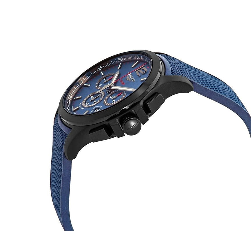 Синий ремешок из каучука стильно смотрится на запястье. Швейцарский кварцевый механизм L289 демонстрирует абсолютную точность хода. Устойчивое к царапинам сапфировое стекло имеет антибликовое покрытиеАнтибликовое покрытиеСлой оксида металла в 0,13-0,3 микрон, благодаря которому стекло часов не бликует и не отражает свет. Антибликовое покрытие уменьшает отражение света в 10 раз, обеспечивая отличную читаемость показателей циферблата.. Функции: вечный календарь, индикатор EOLEOLПредставляет собой систему, уведомляющую владельца часов о необходимости замены элемента питания. За 2 недели до полного разряда батарейки секундная стрелка перестаёт ходить чётко и начинает перепрыгивать на 3-4 деления., хронограф.