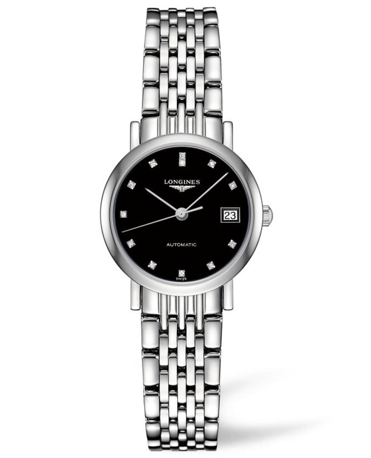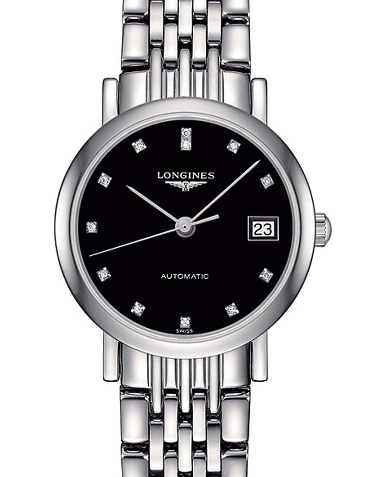 Швейцарские механические часы с автоподзаводом Longines Elegant L4.309.4.57.6. Сапфировое стеклоСапфировое стеклоПрочный и надёжный материал из кристалла сапфира синтетического происхождения, характеризующийся особой твёрдостью и устойчивостью к царапинам и повреждениям. с многослойным антибликовым покрытием с обеих сторон, устойчивое к появлению царапин, обладающее высокой прозрачностью. Корпус часов изготовлен из стали. Циферблат с 12 бриллиантами группы Top Wesselton VS-SI общим весом 0.026 карата. Окошко даты находится в положении 3 часа. Класс водозащиты: 30 метров, позволит защитить корпус от случайных брызг или капель дождя. Стальной браслет на застёжке «бабочка» с кнопкамиЗастёжка "бабочка"Такой вид застёжки дополняется предохранителями, помогающими избежать случайного раскрытия браслета. Обладают изящным исполнением. .