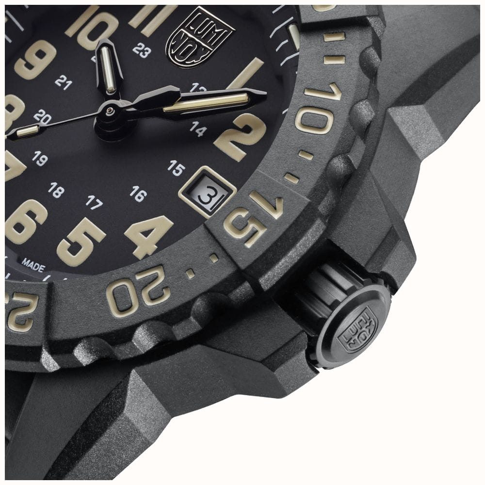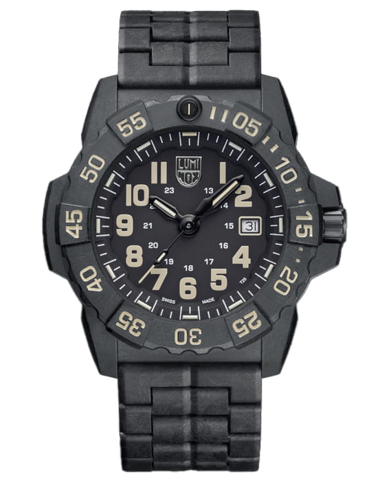 Мужские наручные часы Luminox XS.3510 из коллекции Navy SEAL сочетают в себе спортивный дизайн и надежность швейцарского качества . Модель обладает круглым корпусом диаметром 45 мм, изготовленным из карбонаКарбонОт «carbon», «carbone» - углерод, углепластик - полимерный композиционный материал из переплетённых под определенным углом между собой нитей углеродного волокна, применяется для изготовления лёгких, но прочных деталей. В часах часто используют для украшения циферблатов и ремешков. Так же карбон используется в изготовлении корпусов. Такие корпуса обладают антикоррозионным свойством, не поддаются электромагнитному излучению, обладают повышенной прочностью и противоударностью. (CARBONOX™), что обеспечивает высокую устойчивость к внешним воздействиям при сохранении легкости . Циферблат черного цвета украшен контрастными метками и стрелками с люминесцентным покрытиемЛюминесцентное покрытиеПозволяет считывать показания времени в темноте. Производители наносят на стрелки, часовые индексы, безель или поверхность циферблата светонакопительный состав, дающий холодное свечение., гарантирующим постоянную видимость времени даже в условиях низкой освещенности благодаря системе LLTLLTLLT — это автономный механизм подсветки, основанный на использовании микроскопических газонаполненных элементов. Специальные герметичные капсулы из боросиликатного стекла, интегрированные в циферблат, генерируют свечение без необходимости подключения к внешним источникам энергии. Для их работы не требуется ни дополнительный свет, ни механическое воздействие (например, нажатие кнопки). Свечение возникает благодаря химическому процессу: реакция между тритием, заключенным в капсулах, и люминофорным покрытием создает стабильное автономное освещение. Технология обеспечивает энергетическую независимость и долговечность подсветки. (микрогазовые огни) . Часы оснащены кварцевым механизмом швейцарского производства Ronda 715, обеспечивающим точность хода ±15 секунд в месяц . Защиту циферблата обеспечивает прочное минеральное стеклоМинеральное стеклоМинеральное стекло представляет собой искусственно выращенный минерал кварца. Такое стекло отличается особой устойчивостью к повреждениям и царапинам. Уступает по некоторым качествам сапфировому стеклу. с антибликовым покрытиемАнтибликовое покрытиеСлой оксида металла в 0,13-0,3 микрон, благодаря которому стекло часов не бликует и не отражает свет. Антибликовое покрытие уменьшает отражение света в 10 раз, обеспечивая отличную читаемость показателей циферблата., устойчивое к царапинам и механическим повреждениям . Водонепроницаемость модели достигает 20 атмосфер (200 метров), что делает их подходящими для плавания и активного отдыха на воде, включая дайвинг . Модель также оснащена безелемБезельВнешний ободок, закрепляющий стекло. В спортивных часах так называется поворотное кольцо с делениями на циферблате, выполняет роль таймера – замеряет отрезки времени на шкале. Неподвижный безель – элемент декора. Однонаправленно вращающийся безель на дайверских часах позволяет фиксировать моменты погружения и выныривания на поверхность. с односторонним вращением, что добавляет функциональности при использовании в водных условиях . Ремешок выполнен из черного полиуретана, что обеспечивает комфортное ношение в т