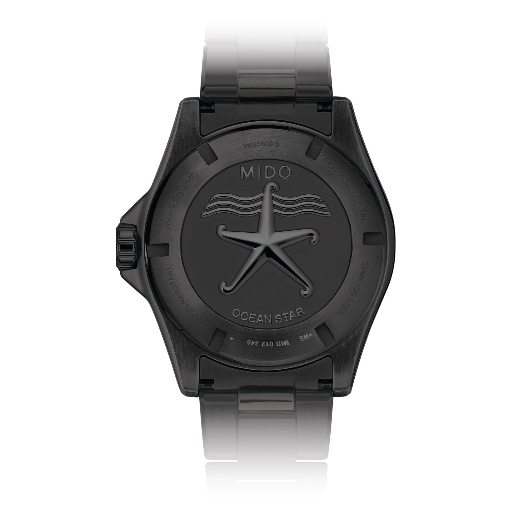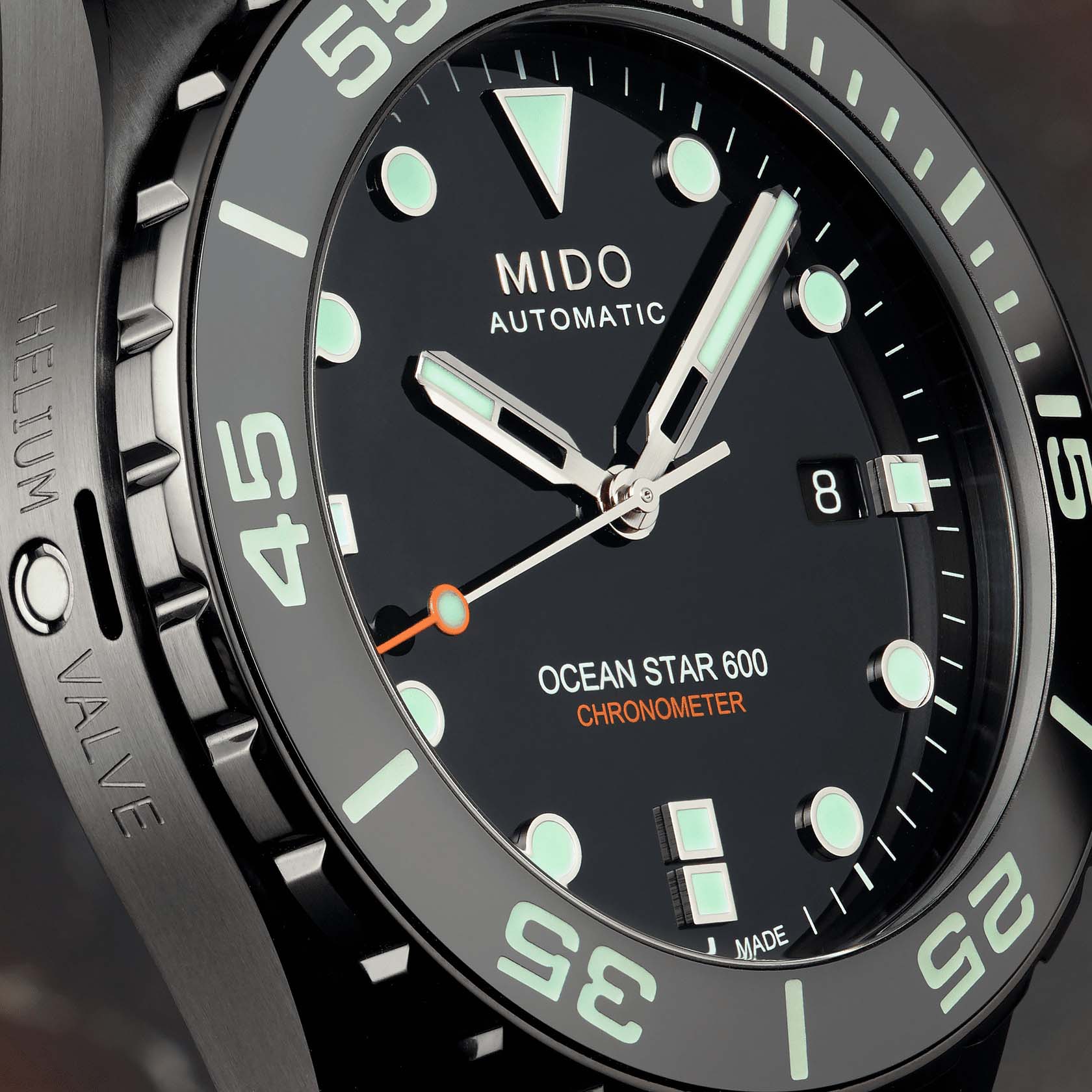Часы MIDO Ocean Star 600 Chronometer (артикул M026.608.33.051.00) — это высокотехнологичная модель, созданная для исследования океанских глубин. Корпус диаметром 43,5 мм выполнен из нержавеющей стали с чёрным DLC-покрытиемDLC-покрытиеDiamond like carbon - одно из лучших видов покрытия, представляющее собой углерод с алмазными свойствами. На поверхность материала наносятся распавшиеся молекулы углерода, превращающиеся в плёнку из алмазоподобных связей, которая перенимает твёрдость алмаза. и керамическим безелем, заполненным люминесцентным составом Super-LumiNova® Grade XЛюминесцентное покрытиеПозволяет считывать показания времени в темноте. Производители наносят на стрелки, часовые индексы, безель или поверхность циферблата светонакопительный состав, дающий холодное свечение.. Водозащита до 60 бар (600 метров), гелиевый клапан обеспечивают функциональность для глубоководных погружений. Чёрный циферблат с накладными часовыми метками, покрытыми Super-LumiNova®Люминесцентное покрытиеПозволяет считывать показания времени в темноте. Производители наносят на стрелки, часовые индексы, безель или поверхность циферблата светонакопительный состав, дающий холодное свечение., защищён сапфировым стекломСапфировое стеклоПрочный и надёжный материал из кристалла сапфира синтетического происхождения, характеризующийся особой твёрдостью и устойчивостью к царапинам и повреждениям. с двусторонним антибликовым покрытием.