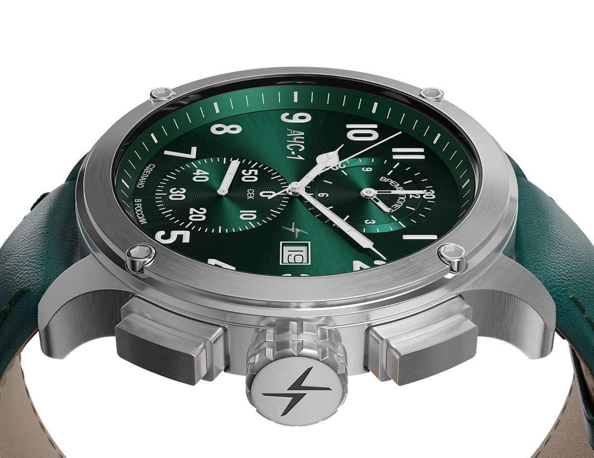 Мужские кварцевые часы — это стильный и функциональный аксессуар с хронографом. Корпус диаметром 44 мм выполнен из нержавеющей стали 316L с матовой полировкой, включая безельБезельВнешний ободок, закрепляющий стекло. В спортивных часах так называется поворотное кольцо с делениями на циферблате, выполняет роль таймера – замеряет отрезки времени на шкале. Неподвижный безель – элемент декора. Однонаправленно вращающийся безель на дайверских часах позволяет фиксировать моменты погружения и выныривания на поверхность., кнопки и заводную головку. Циферблат зелёного цвета оформлен индексами и стрелками. Стрелки и метки с люминесцентным покрытиемЛюминесцентное покрытиеПозволяет считывать показания времени в темноте. Производители наносят на стрелки, часовые индексы, безель или поверхность циферблата светонакопительный состав, дающий холодное свечение. Super-LumiNova, обеспечивающим хорошую читаемость в темноте. Циферблат защищён сапфировым стекломСапфировое стеклоПрочный и надёжный материал из кристалла сапфира синтетического происхождения, характеризующийся особой твёрдостью и устойчивостью к царапинам и повреждениям.. Механизм — швейцарский кварцевый калибр Ronda 3520.D с функциями хронографаХронографФункция позволяет измерять отрезки времени с особой точностью: часы, минуты, секунды. Верным признаком хронографа является наличие на циферблате 3 дополнительных окошек-счётчиков. и секундомераСекундомерСекундоме́р — прибор, способный измерять интервалы времени с точностью до долей секунды.. Часы оснащены кожаным ремешком зелёного цвета с классической пряжкой. Водонепроницаемость 100 м позволяет использовать часы для плавания и повседневного ношения. Идеальный выбор для тех, кто ценит точность, качество и выразительный дизайн.
