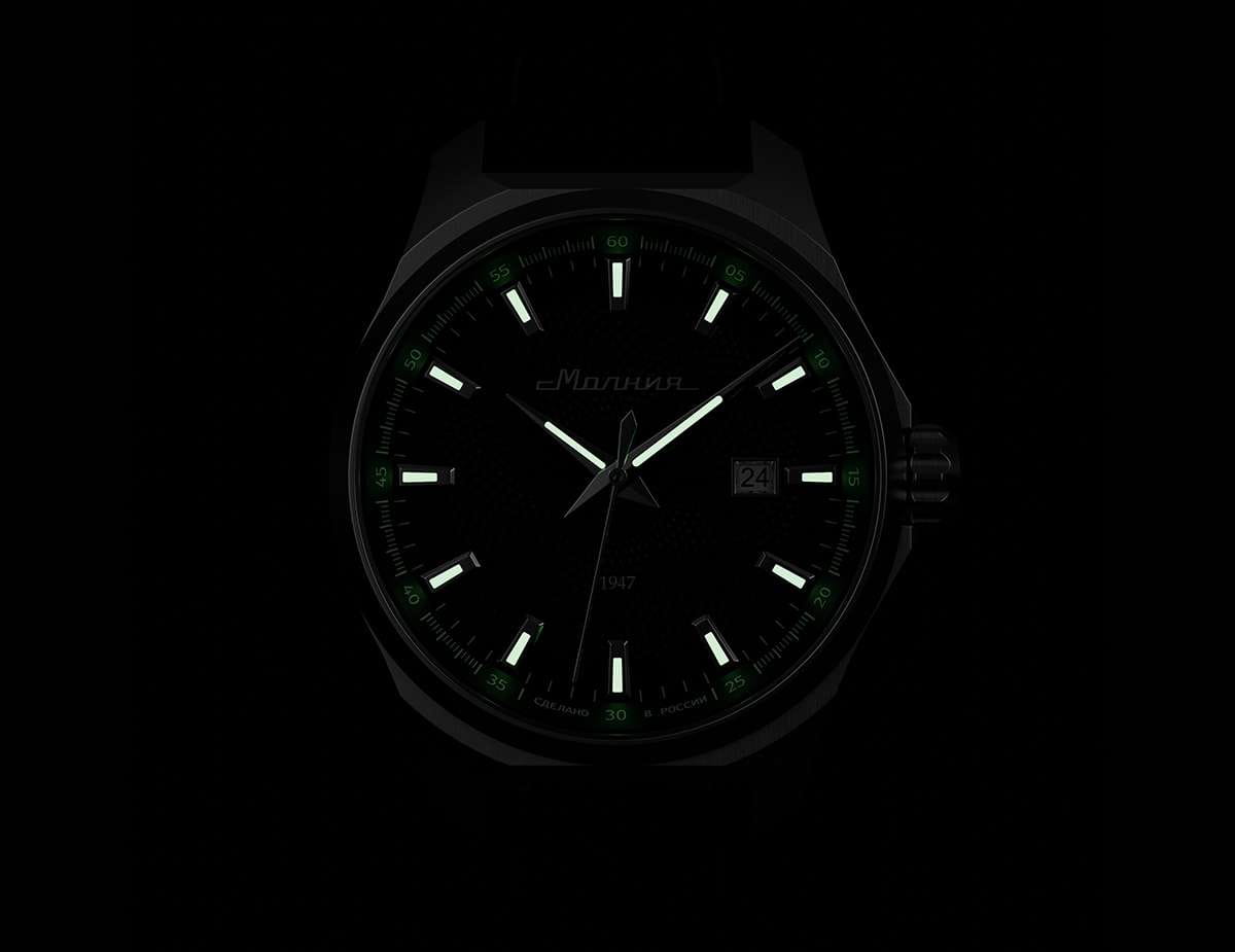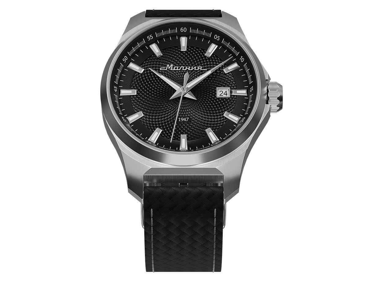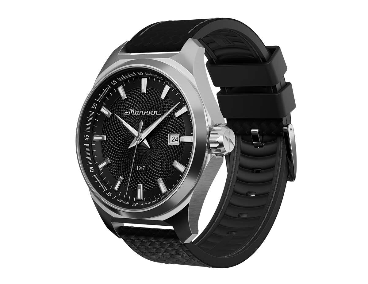 Мужские механические часы с автоподзаводом — это надёжный аксессуар от легендарного бренда «МОЛНИЯ», созданный на Челябинском часовом заводе. Корпус диаметром 42 мм выполнен из нержавеющей стали 316L с зеркальной полировкой. БезельБезельВнешний ободок, закрепляющий стекло. В спортивных часах так называется поворотное кольцо с делениями на циферблате, выполняет роль таймера – замеряет отрезки времени на шкале. Неподвижный безель – элемент декора. Однонаправленно вращающийся безель на дайверских часах позволяет фиксировать моменты погружения и выныривания на поверхность. также выполнен из стали с зеркальной отделкой. Циферблат чёрного цвета оформлен индексами и стрелками. Окошко даты расположено в положении 3 часов. Стрелки и метки с люминесцентным покрытиемЛюминесцентное покрытиеПозволяет считывать показания времени в темноте. Производители наносят на стрелки, часовые индексы, безель или поверхность циферблата светонакопительный состав, дающий холодное свечение. Super-LumiNova, обеспечивающим хорошую читаемость в темноте. Циферблат защищён сапфировым стекломСапфировое стеклоПрочный и надёжный материал из кристалла сапфира синтетического происхождения, характеризующийся особой твёрдостью и устойчивостью к царапинам и повреждениям. с антибликовым покрытиемАнтибликовое покрытиеСлой оксида металла в 0,13-0,3 микрон, благодаря которому стекло часов не бликует и не отражает свет. Антибликовое покрытие уменьшает отражение света в 10 раз, обеспечивая отличную читаемость показателей циферблата.. Механизм — японский автоматический калибр Miyota 8215 с функцией и запасом хода до 42 часов. Прозрачная задняя крышка позволяет наблюдать за работой механизма с кастомным ротором. Часы оснащены кожаным ремешком чёрного цвета с подкладкой из фтористого каучука и классической пряжкой, а также системой быстрой замены. Водонепроницаемость 100 м позволяет использовать часы для плавания и повседневного ношения. Идеальный выбор для тех, кто ценит качество, точность и стиль.