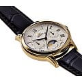 Наручные часы являются отражением винтажного стиля, гильошированный белый циферблат дополнен тонкими римскими цифрами, изысканности придаёт классический чёрный ремешок из натуральной кожи. Уникальность модели в нижнем окошке с изображением луны и солнца, так дизайнеры красиво преподносят нам смену дня и ночи. Кварцевый высокоточный калибр Orient KUE00. Сапфировое стекло. Водозащита до 5 бар. Корпус из хирургической стали 316L с цветным PVD-финишемPVDУльтратонкое покрытие наносится в технике вакуумного напыления, сочетает в себе нитрид титана особой прочности со слоем золота или оксида хрома. Несёт в себе декоративную или защитную функцию. золотистого оттенка. Отображение числа и дня недели. Диаметр корпуса: 43,8 мм.