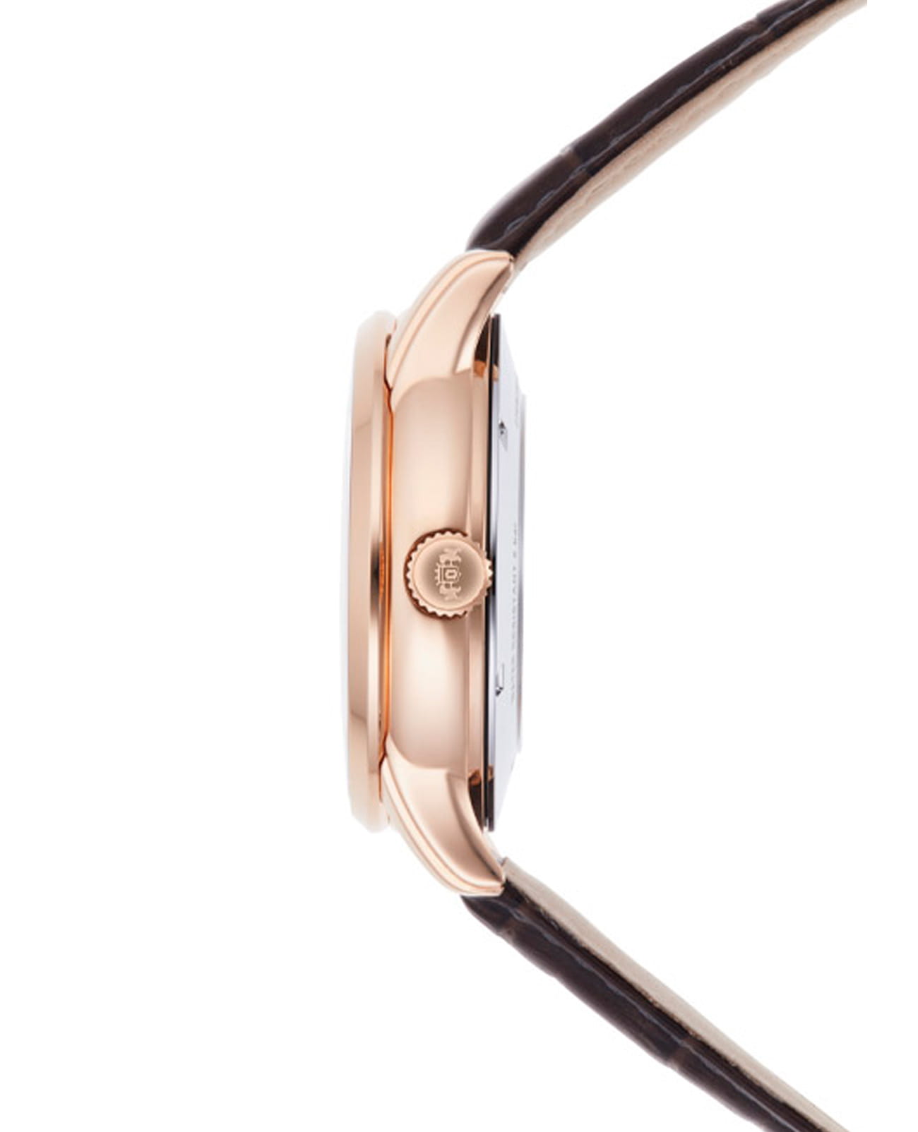 День недели и индикатор день/ночь вынесены на отдельные циферблаты, что делает использование часов удобным и информативным. Метки на циферблате представлены в виде штрихов и римских цифр, что придает часам элегантный и сдержанный облик.