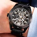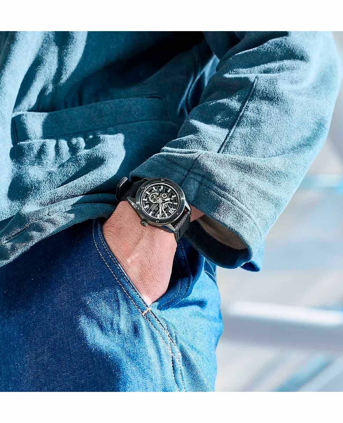Частично скелетонизированный циферблат открывает вид на внутренний механизм, добавляя часам элемент технической изысканности. Верхняя пластина циферблата с контрастными индексами и текстурами создает эффект глубины, а секундная стрелка выделяется на фоне, подчеркивая динамичность дизайна. Стрелки часов оснащены люминесцентным покрытиемЛюминесцентное покрытиеПозволяет считывать показания времени в темноте. Производители наносят на стрелки, часовые индексы, безель или поверхность циферблата светонакопительный состав, дающий холодное свечение., обеспечивающим подсветку в темноте, что позволяет легко считывать время даже в условиях недостаточной освещенности.