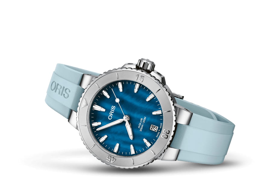 Дайверские часы Aquis Date синего эгейского цвета выделяются контрастным циферблатом. Изготовленный из перламутра, циферблат переливается, как вода на закате, придавая элегантность высокопроизводительным часам. Эти часы с коническим силуэтом являются запоминающимся элементом коллекции Aquis.