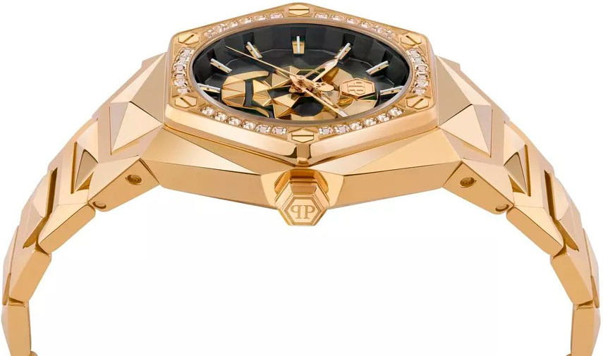Часы Philipp Plein PWPWA0824 из коллекции Skull Spikes — это женская модель, сочетающая смелый дизайн и высокое качество исполнения. Корпус диаметром 45 мм выполнен из нержавеющей стали с PVD-покрытиемPVDУльтратонкое покрытие наносится в технике вакуумного напыления, сочетает в себе нитрид титана особой прочности со слоем золота или оксида хрома. Несёт в себе декоративную или защитную функцию. черного цвета, что придаёт часам элегантный и современный вид. Черный циферблат украшен фирменным мотивом черепа и защищён минеральным стекломМинеральное стеклоМинеральное стекло представляет собой искусственно выращенный минерал кварца. Такое стекло отличается особой устойчивостью к повреждениям и царапинам. Уступает по некоторым качествам сапфировому стеклу., устойчивым к царапинам. БезельБезельВнешний ободок, закрепляющий стекло. В спортивных часах так называется поворотное кольцо с делениями на циферблате, выполняет роль таймера – замеряет отрезки времени на шкале. Неподвижный безель – элемент декора. Однонаправленно вращающийся безель на дайверских часах позволяет фиксировать моменты погружения и выныривания на поверхность. с PVD-покрытиемPVDУльтратонкое покрытие наносится в технике вакуумного напыления, сочетает в себе нитрид титана особой прочности со слоем золота или оксида хрома. Несёт в себе декоративную или защитную функцию. инкрустирован кристаллами.