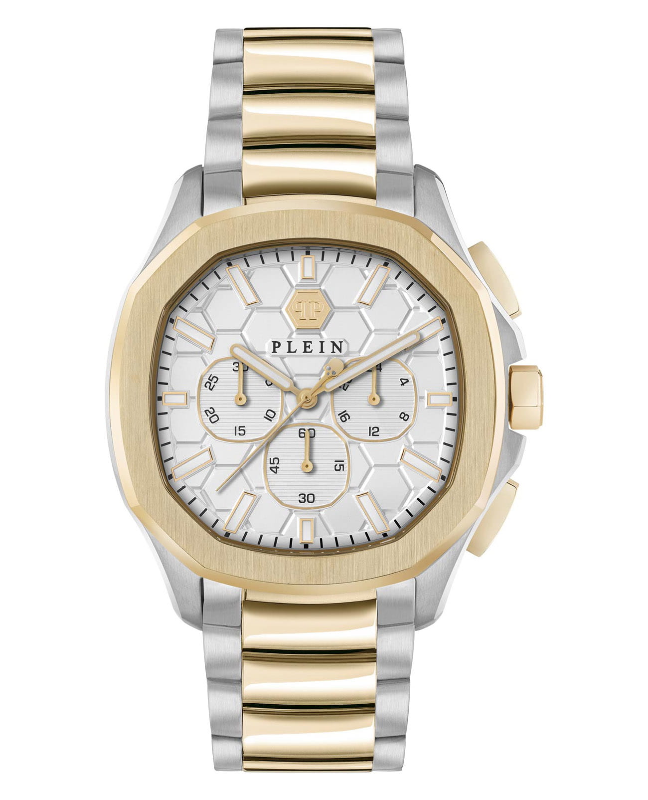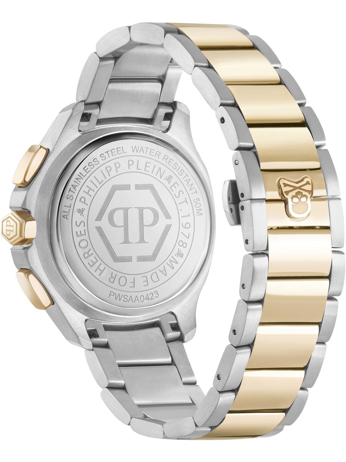 Яркие мужские часы-хронографХронографФункция позволяет измерять отрезки времени с особой точностью: часы, минуты, секунды. Верным признаком хронографа является наличие на циферблате 3 дополнительных окошек-счётчиков. с секундомеромСекундомерСекундоме́р — прибор, способный измерять интервалы времени с точностью до долей секунды.  Philipp Plein PWSAA0423, кварцевый механизм с высокой точностью. Класс водозащиты: 50 метров, позволит защитить корпус от случайных брызг или капель дождя. Корпус часов изготовлен из стали с IP-покрытиемIP-покрытиеМетод ионного напыления. Демонстрирует повышенную устойчивость к истиранию, окислению и химическим веществам. Под воздействием высокого давления и температуры около 1500°C молекулы металла надёжно соединяются с частицами корпуса часов.. Стрелки и метки с люминесцентным покрытиемЛюминесцентное покрытиеПозволяет считывать показания времени в темноте. Производители наносят на стрелки, часовые индексы, безель или поверхность циферблата светонакопительный состав, дающий холодное свечение.. Застёжка бабочка с кнопкамиЗастёжка "бабочка"Такой вид застёжки дополняется предохранителями, помогающими избежать случайного раскрытия браслета. Обладают изящным исполнением.