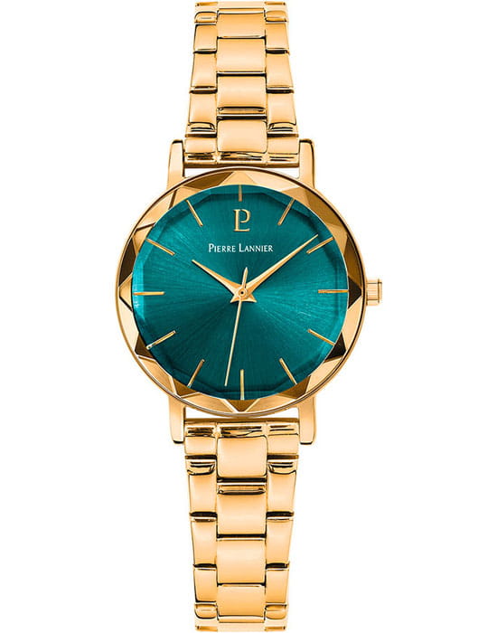 Pierre Lannier 012P562 Multiples — элегантная женская модель, в которой сочетаются современный стиль и утончённая простота. Корпус диаметром 30 мм выполнен из нержавеющей стали с изящным золотистым IP-покрытиемIP-покрытиеМетод ионного напыления. Демонстрирует повышенную устойчивость к истиранию, окислению и химическим веществам. Под воздействием высокого давления и температуры около 1500°C молекулы металла надёжно соединяются с частицами корпуса часов., создающим ощущение тепла и благородства. Циферблат насыщенного зелёного оттенка с эффектом солнечных лучей украшен тонкими золотистыми стрелками и часовыми метками. Композиция оформлена минималистично, подчёркивая утончённость формы и цветовое равновесие. Циферблат защищён прочным минеральным стекломМинеральное стеклоМинеральное стекло представляет собой искусственно выращенный минерал кварца. Такое стекло отличается особой устойчивостью к повреждениям и царапинам. Уступает по некоторым качествам сапфировому стеклу., которое надёжно противостоит повседневным повреждениям. Внутри — точный японский кварцевый механизм, отличающийся стабильностью и долговечностью. Браслет из нержавеющей стали, выполненный в мелком плетении, гармонично дополняет корпус и завершён надёжной раскладной застёжкойРаскладная застёжкаТакой тип застёжки используется только на браслетах из металла. Она никогда не раскрывается полностью, происходит разделение на 2 и более частей. Раскладывающая застёжка снизит вероятность потери часов к минимуму., обеспечивающей комфортное ношение. Водонепроницаемость до 5 ATM делает часы устойчивыми к случайным брызгам и дождю. 012P562 Multiples — это сочетание выразительного цвета, утончённого блеска и точности, подходящее как для повседневного образа, так и для особых случаев.