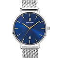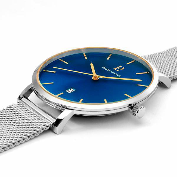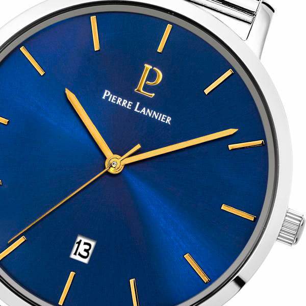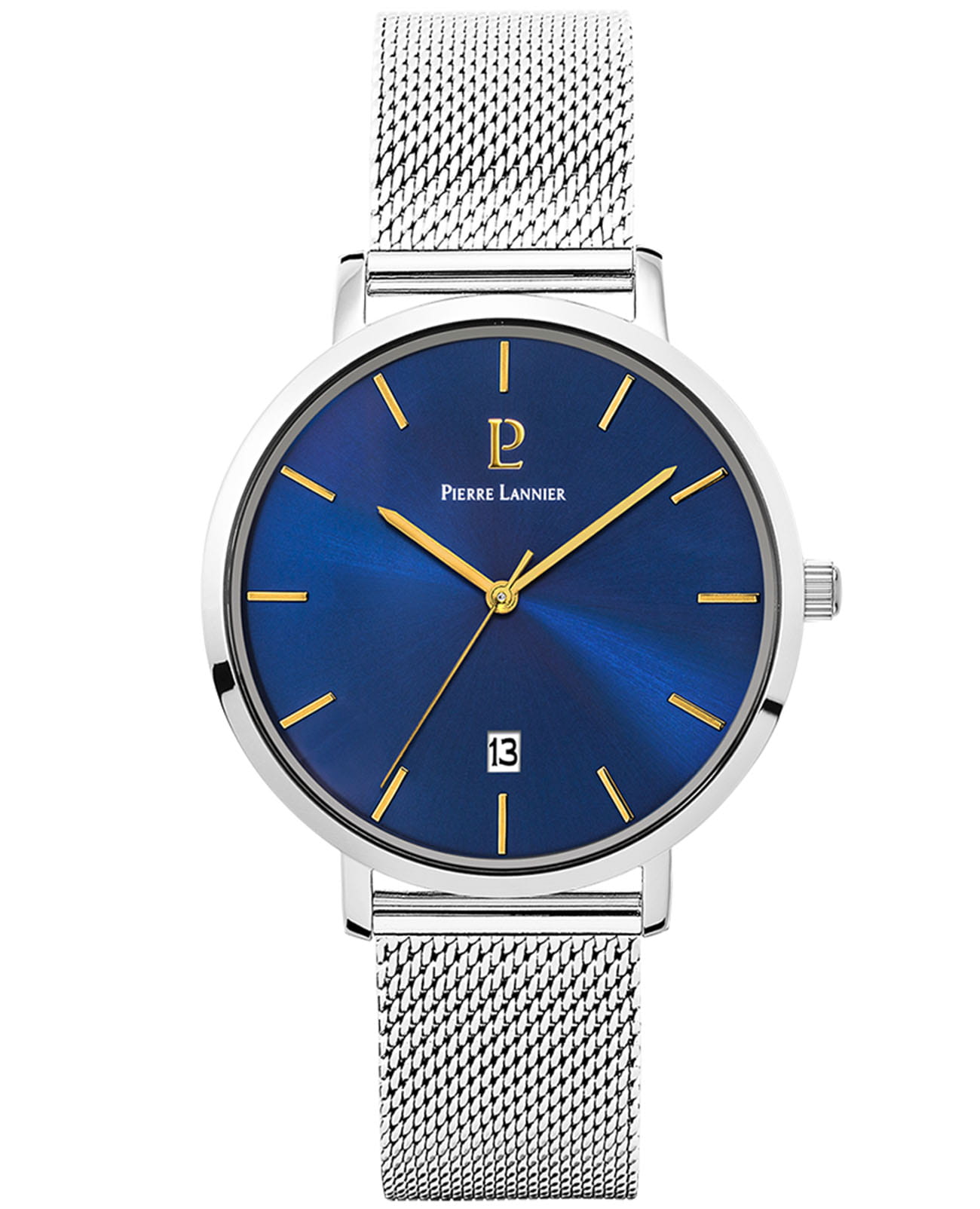 Мужские кварцевые часы Pierre Lannier Echo 370H168. Центральные часовая, минутная и секундная стрелки. Синий циферблат с часовыми индексами в виде штрихов. Окошко даты в позиции 6 часов. Круглый корпус выполнен из полированной нержавеющей стали. Стальной браслет выполнен в технике миланского плетения, раскладная застёжкаРаскладная застёжкаТакой тип застёжки используется только на браслетах из металла. Она никогда не раскрывается полностью, происходит разделение на 2 и более частей. Раскладывающая застёжка снизит вероятность потери часов к минимуму.. Прочное минеральное стеклоМинеральное стеклоМинеральное стекло представляет собой искусственно выращенный минерал кварца. Такое стекло отличается особой устойчивостью к повреждениям и царапинам. Уступает по некоторым качествам сапфировому стеклу., устойчивое к мелким механическим повреждениям. Водостойкость: 30 метров, позволит защитить корпус от случайных брызг или капель дождя.