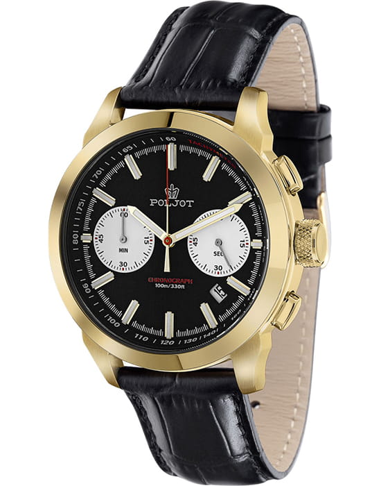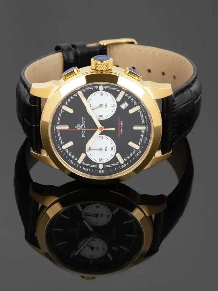 Poljot 6S21.746034 — классические мужские часы, в которых традиции российского часового мастерства сочетаются с современным дизайном. Корпус из нержавеющей стали с PVD-покрытиемPVDУльтратонкое покрытие наносится в технике вакуумного напыления, сочетает в себе нитрид титана особой прочности со слоем золота или оксида хрома. Несёт в себе декоративную или защитную функцию. подчёркивает солидность и надёжность модели, а насыщенный циферблат с лучевой текстурой придаёт образу выразительность и глубину. Два дополнительных счётчика хронографаХронографФункция позволяет измерять отрезки времени с особой точностью: часы, минуты, секунды. Верным признаком хронографа является наличие на циферблате 3 дополнительных окошек-счётчиков. обеспечивают точное измерение интервалов времени, дополняя функциональность часов. Контрастные стрелки и метки с люминесцентным покрытиемЛюминесцентное покрытиеПозволяет считывать показания времени в темноте. Производители наносят на стрелки, часовые индексы, безель или поверхность циферблата светонакопительный состав, дающий холодное свечение. обеспечивают отличную читаемость даже в условиях слабого освещения. Прочное минеральное стеклоМинеральное стеклоМинеральное стекло представляет собой искусственно выращенный минерал кварца. Такое стекло отличается особой устойчивостью к повреждениям и царапинам. Уступает по некоторым качествам сапфировому стеклу. защищает циферблат от царапин, а ремешок из натуральной кожи с классической пряжкой гарантирует комфорт и элегантную посадку на запястье. Poljot — это надёжный спутник современного мужчины, объединяющий точность, стиль и характер.