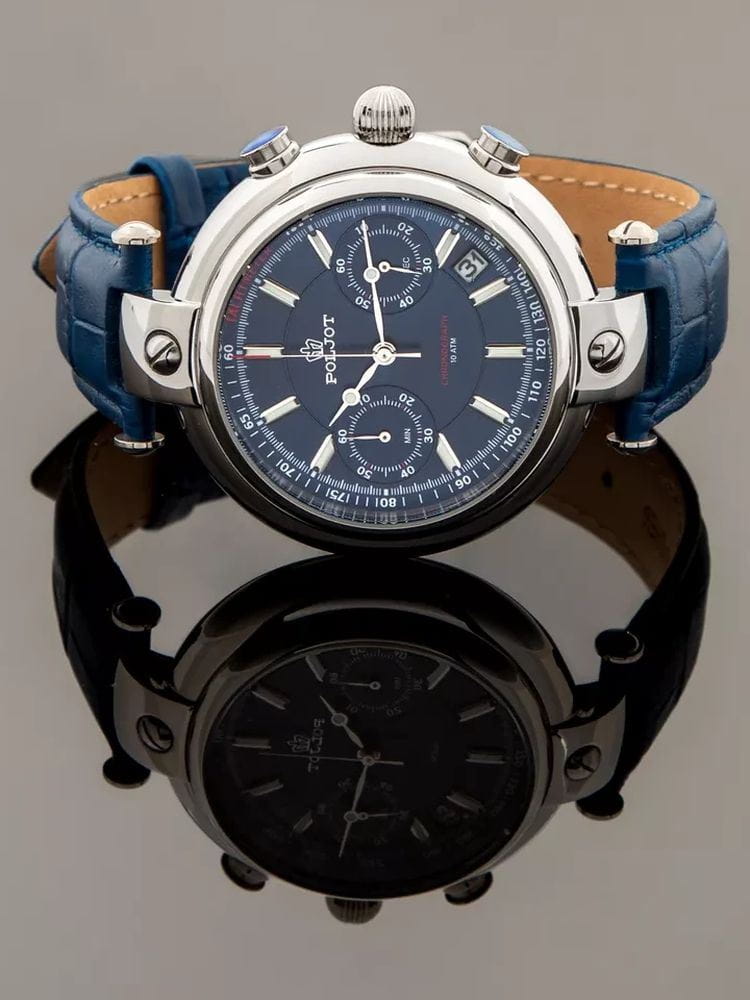 Poljot 6S21.961226 “Baikal” — элегантные кварцевые мужские часы, в которых классическая строгость сочетается с выразительным российским характером. Корпус из нержавеющей стали с крупными декоративными ушками придаёт модели солидность и узнаваемость, а глубокий циферблат с контрастными стрелками и индексами с люминесцентным покрытиемЛюминесцентное покрытиеПозволяет считывать показания времени в темноте. Производители наносят на стрелки, часовые индексы, безель или поверхность циферблата светонакопительный состав, дающий холодное свечение. подчёркивает точность и функциональность. Два дополнительных счётчика хронографаХронографФункция позволяет измерять отрезки времени с особой точностью: часы, минуты, секунды. Верным признаком хронографа является наличие на циферблате 3 дополнительных окошек-счётчиков. обеспечивают измерение времени с высокой точностью, а окно даты добавляет практичности. Прочное минеральное стеклоМинеральное стеклоМинеральное стекло представляет собой искусственно выращенный минерал кварца. Такое стекло отличается особой устойчивостью к повреждениям и царапинам. Уступает по некоторым качествам сапфировому стеклу. защищает циферблат от царапин, а ремешок из натуральной кожи с классической пряжкой гарантирует комфорт и надёжную фиксацию на запястье. Poljot “Baikal” — это сочетание традиций, надёжности и уверенного стиля, созданное для мужчин, ценящих точность и благородную сдержанность.