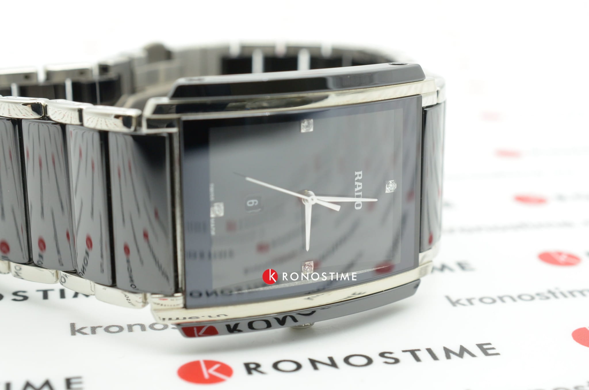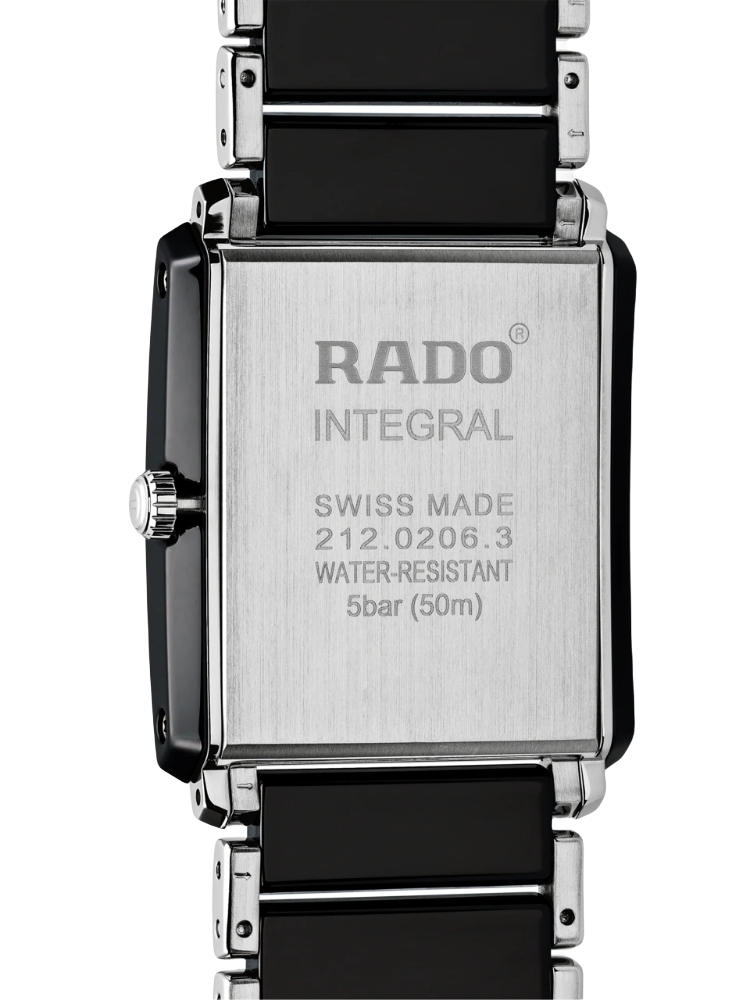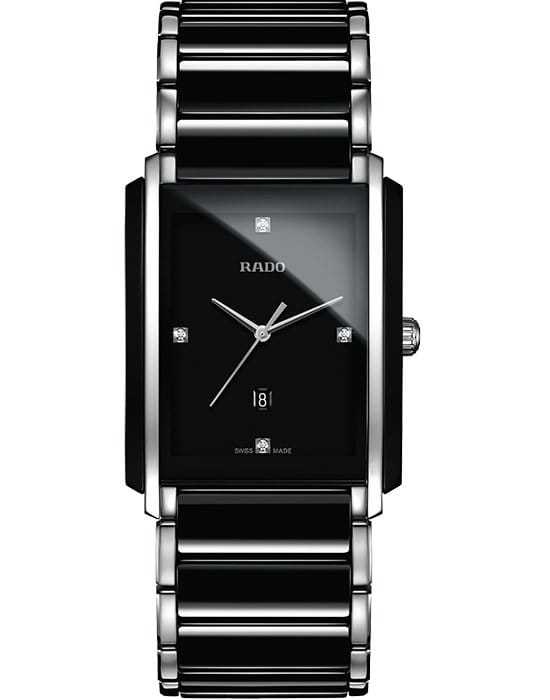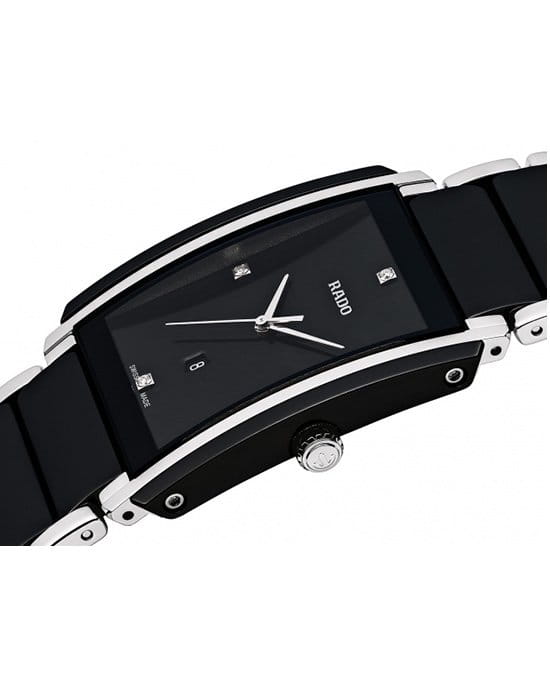 Часы Rado Integral Diamonds (артикул R20206712) представляют собой элегантное сочетание высокотехнологичной керамикиВысокотехнологичная керамикаИнновационный запатентованный Rado материал с гладкой или матовой поверхностью. Керамика за счёт кристаллической структуры обладает повышенной устойчивостью от возникновения царапин. Материал способен принимать температуру тела человека, обеспечивая невероятный комфорт при ношении. и нержавеющей стали, дополненное бриллиантовыми акцентами. Корпус размером 31,0 x 41,1 мм выполнен из комбинированных материалов с водозащитой до 5 бар (50 метров). Чёрный циферблат украшен четырьмя бриллиантовыми часовыми метками и окошком даты в положении «6 часов». Циферблат защищён сапфировым стекломСапфировое стеклоПрочный и надёжный материал из кристалла сапфира синтетического происхождения, характеризующийся особой твёрдостью и устойчивостью к царапинам и повреждениям., устойчивым к царапинам.