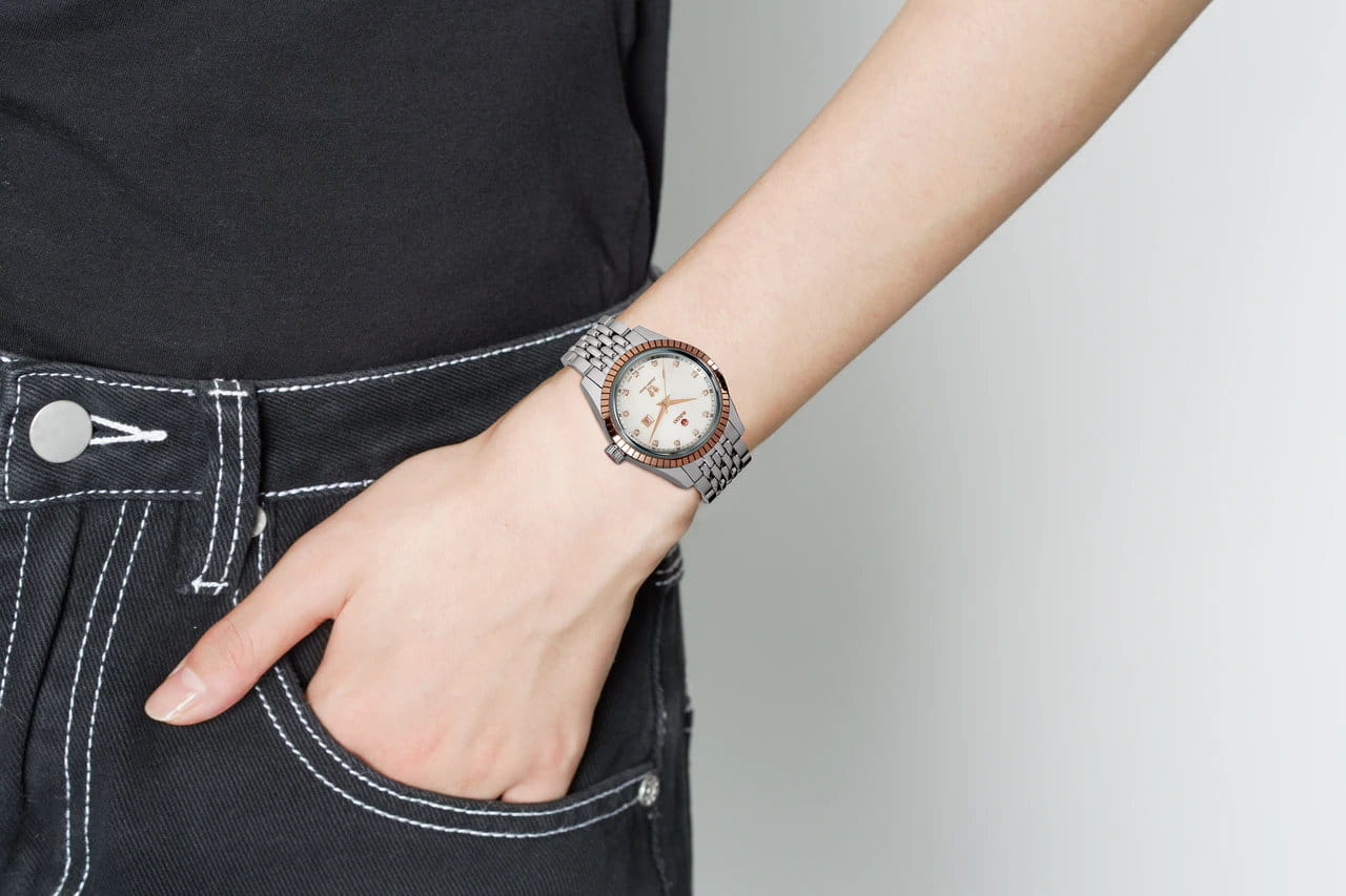 Аксессуар премиального характера - то, что действительно нужно, если вы желаете всегда находиться в центре внимания окружающих. Лаконичный перламутровый циферблат с узнаваемыми логотипами бренда украшен 12 бриллиантами в 0,078 карат, придавая модели роскошный вид. Шикарно смотрится стальной браслет из мельчайших звеньев. Корпус часов из стали 316L и материала CeramosCeramosМатериал являет собой инновационное сочетание высокотехнологичной керамики и сплава металла. Он объединяет керамическую устойчивость к царапинам и металлический роскошный блеск. оттенка розового золота заключает в себе автоматический калибр ETA 2671 с 38-часовым запасом хода. Скелетонизированная задняя крышка. Антибликовое покрытие стекла из сапфира. Прямоугольное окошко даты. Диаметр корпуса: 35 мм.