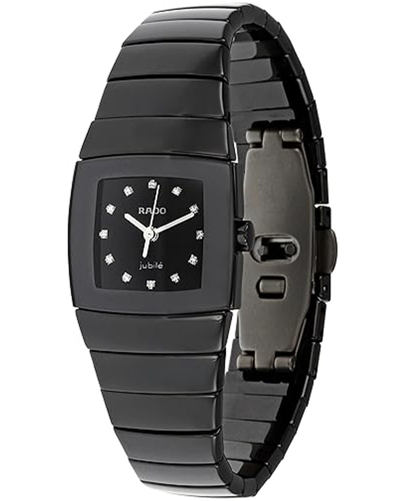 Часы Rado Sintra R13726752, произведение искусства и технологическое чудо, станут прекрасным дополнением к коллекции. Эти швейцарские часы оснащены кварцевым механизмом. Корпус изготовлен из высокотехнологичной керамикиВысокотехнологичная керамикаИнновационный запатентованный Rado материал с гладкой или матовой поверхностью. Керамика за счёт кристаллической структуры обладает повышенной устойчивостью от возникновения царапин. Материал способен принимать температуру тела человека, обеспечивая невероятный комфорт при ношении.. Браслет изготовлен из CeramosCeramosМатериал являет собой инновационное сочетание высокотехнологичной керамики и сплава металла. Он объединяет керамическую устойчивость к царапинам и металлический роскошный блеск. . Сапфировое стеклоСапфировое стеклоПрочный и надёжный материал из кристалла сапфира синтетического происхождения, характеризующийся особой твёрдостью и устойчивостью к царапинам и повреждениям. устойчивое к появлению царапин, обладающее высокой прозрачностью. Класс водозащиты: 30 метров, позволит защитить корпус от случайных брызг или капель дождя. Циферблат с бриллиантовыми метками.