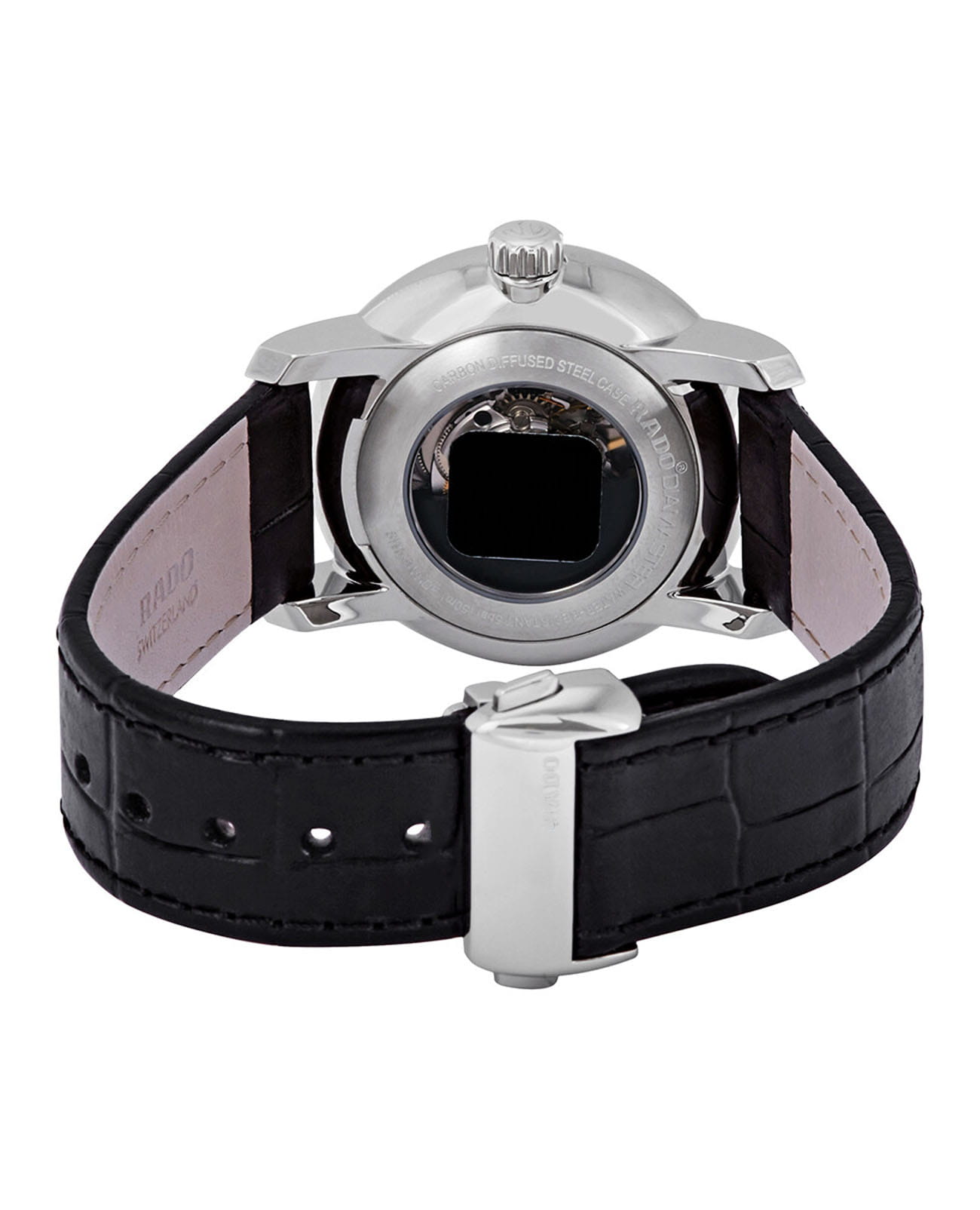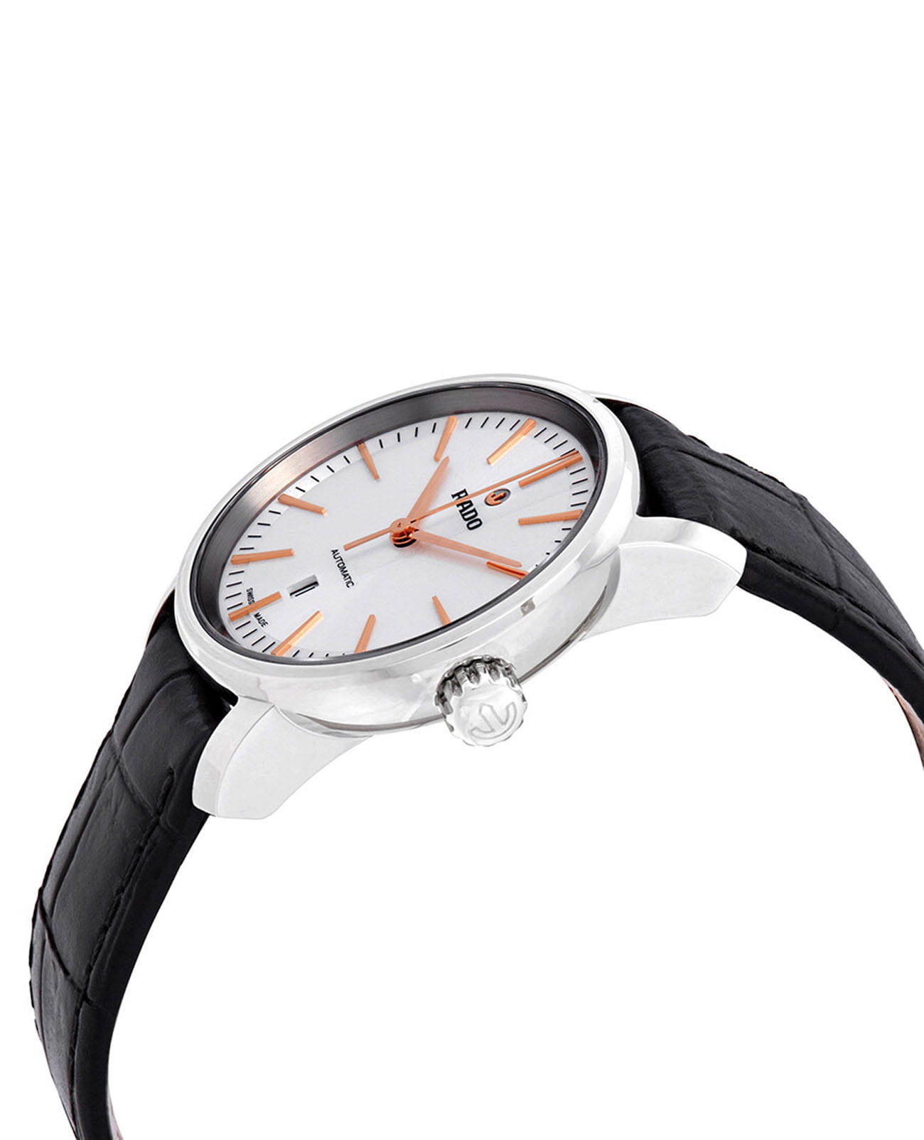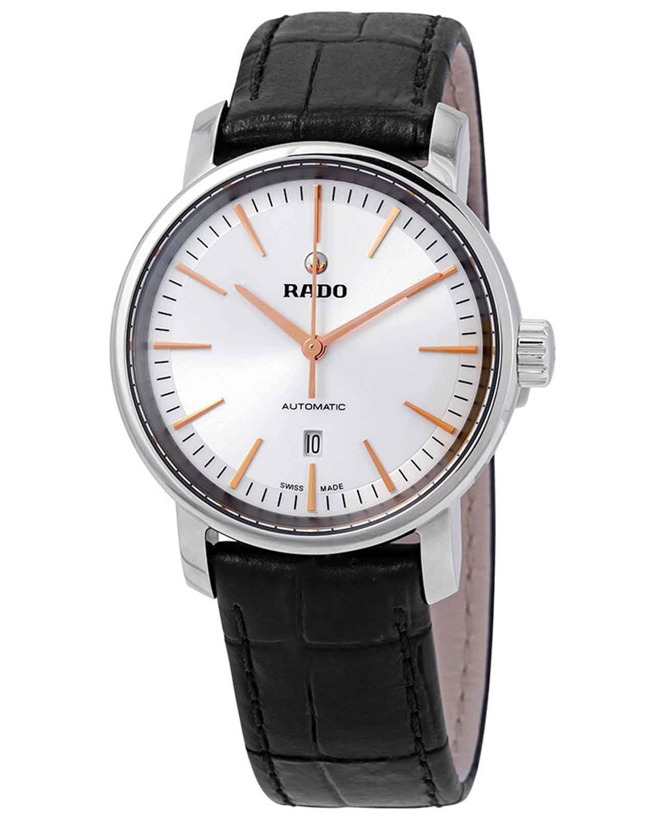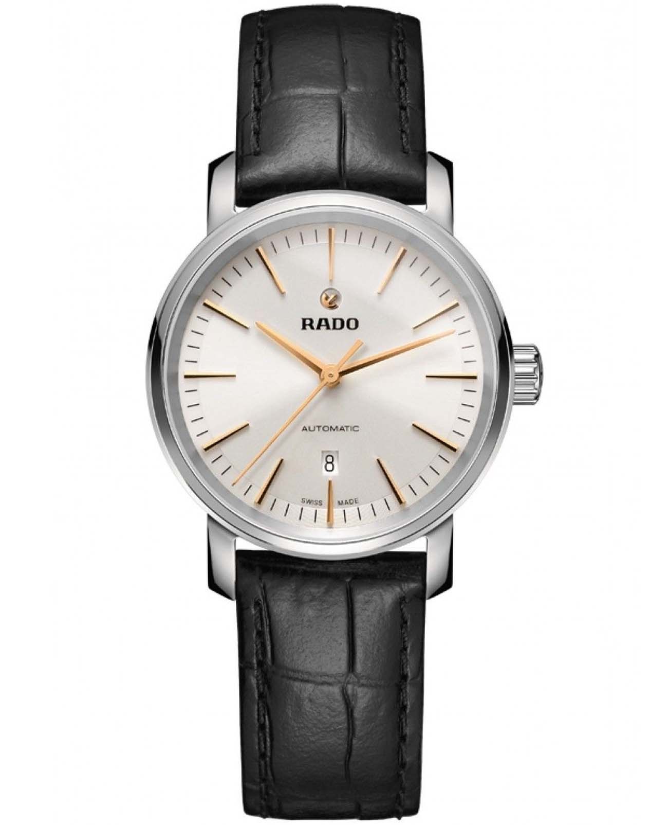 Женские швейцарские механические часы с автоподзаводом Rado Diamaster R14050105. Корпус часов изготовлен из нержавеющей стали. Сапфировое стеклоСапфировое стеклоПрочный и надёжный материал из кристалла сапфира синтетического происхождения, характеризующийся особой твёрдостью и устойчивостью к царапинам и повреждениям. устойчивое к мелким механическим повреждениям. Окошко даты находится в положении 6 часов. Класс водозащиты: 50 метров, позволит защитить корпус от случайных брызг или капель дождя. Кожаный ремешок с раскладной застёжкойРаскладная застёжкаТакой тип застёжки используется только на браслетах из металла. Она никогда не раскрывается полностью, происходит разделение на 2 и более частей. Раскладывающая застёжка снизит вероятность потери часов к минимуму..