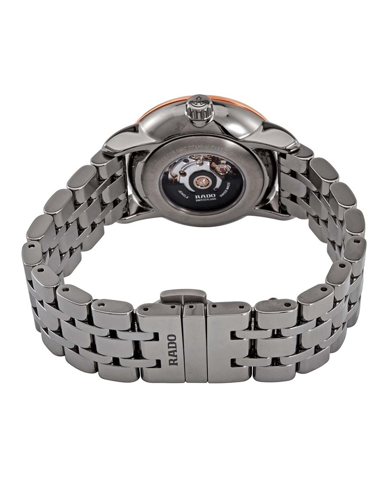 Женские механические швейцарские часы с автоподзаводом Rado Diamaster R14097717. Сапфировое стеклоСапфировое стеклоПрочный и надёжный материал из кристалла сапфира синтетического происхождения, характеризующийся особой твёрдостью и устойчивостью к царапинам и повреждениям. устойчивое к мелким механическим повреждениям. Корпус часов изготовлен из стали высокотехнологичной керамикиВысокотехнологичная керамикаИнновационный запатентованный Rado материал с гладкой или матовой поверхностью. Керамика за счёт кристаллической структуры обладает повышенной устойчивостью от возникновения царапин. Материал способен принимать температуру тела человека, обеспечивая невероятный комфорт при ношении.. БезельБезельВнешний ободок, закрепляющий стекло. В спортивных часах так называется поворотное кольцо с делениями на циферблате, выполняет роль таймера – замеряет отрезки времени на шкале. Неподвижный безель – элемент декора. Однонаправленно вращающийся безель на дайверских часах позволяет фиксировать моменты погружения и выныривания на поверхность. из стали с PVD-покрытиемPVDУльтратонкое покрытие наносится в технике вакуумного напыления, сочетает в себе нитрид титана особой прочности со слоем золота или оксида хрома. Несёт в себе декоративную или защитную функцию. и циферблат украшены бриллиантами. Окошко даты находится в положении 3 часа. Класс водозащиты: 50 метров, позволит защитить корпус от случайных брызг или капель дождя. Браслет из высокотехнологичной керамикиВысокотехнологичная керамикаИнновационный запатентованный Rado материал с гладкой или матовой поверхностью. Керамика за счёт кристаллической структуры обладает повышенной устойчивостью от возникновения царапин. Материал способен принимать температуру тела человека, обеспечивая невероятный комфорт при ношении. на раскладной застёжкеРаскладная застёжкаТакой тип застёжки используется только на браслетах из металла. Она никогда не раскрывается полностью, происходит разделение на 2 и более частей. Раскладывающая застёжка снизит вероятность потери часов к минимуму..