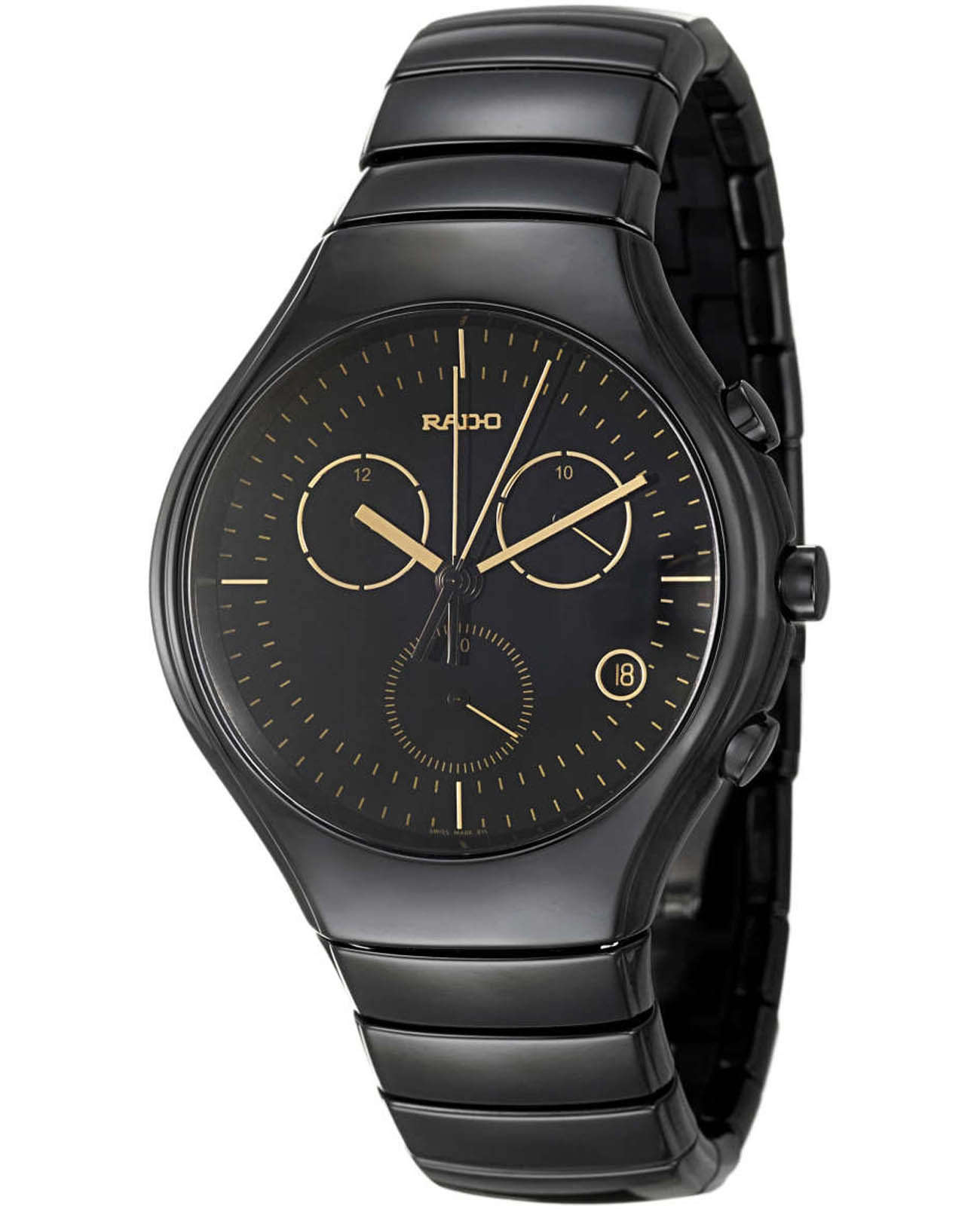 Мужские швейцарские часы-хронографХронографФункция позволяет измерять отрезки времени с особой точностью: часы, минуты, секунды. Верным признаком хронографа является наличие на циферблате 3 дополнительных окошек-счётчиков. Rado True R27814152. Сапфировое стеклоСапфировое стеклоПрочный и надёжный материал из кристалла сапфира синтетического происхождения, характеризующийся особой твёрдостью и устойчивостью к царапинам и повреждениям. устойчивое к мелким механическим повреждениям. Корпус часов изготовлен из высокотехнологичной керамикиВысокотехнологичная керамикаИнновационный запатентованный Rado материал с гладкой или матовой поверхностью. Керамика за счёт кристаллической структуры обладает повышенной устойчивостью от возникновения царапин. Материал способен принимать температуру тела человека, обеспечивая невероятный комфорт при ношении.. Класс водозащиты: 30 метров, позволит защитить корпус от случайных брызг или капель дождя. Браслет из высокотехнологичной керамикиВысокотехнологичная керамикаИнновационный запатентованный Rado материал с гладкой или матовой поверхностью. Керамика за счёт кристаллической структуры обладает повышенной устойчивостью от возникновения царапин. Материал способен принимать температуру тела человека, обеспечивая невероятный комфорт при ношении. на застёжке-бабочке с кнопкамиЗастёжка "бабочка"Такой вид застёжки дополняется предохранителями, помогающими избежать случайного раскрытия браслета. Обладают изящным исполнением. .
