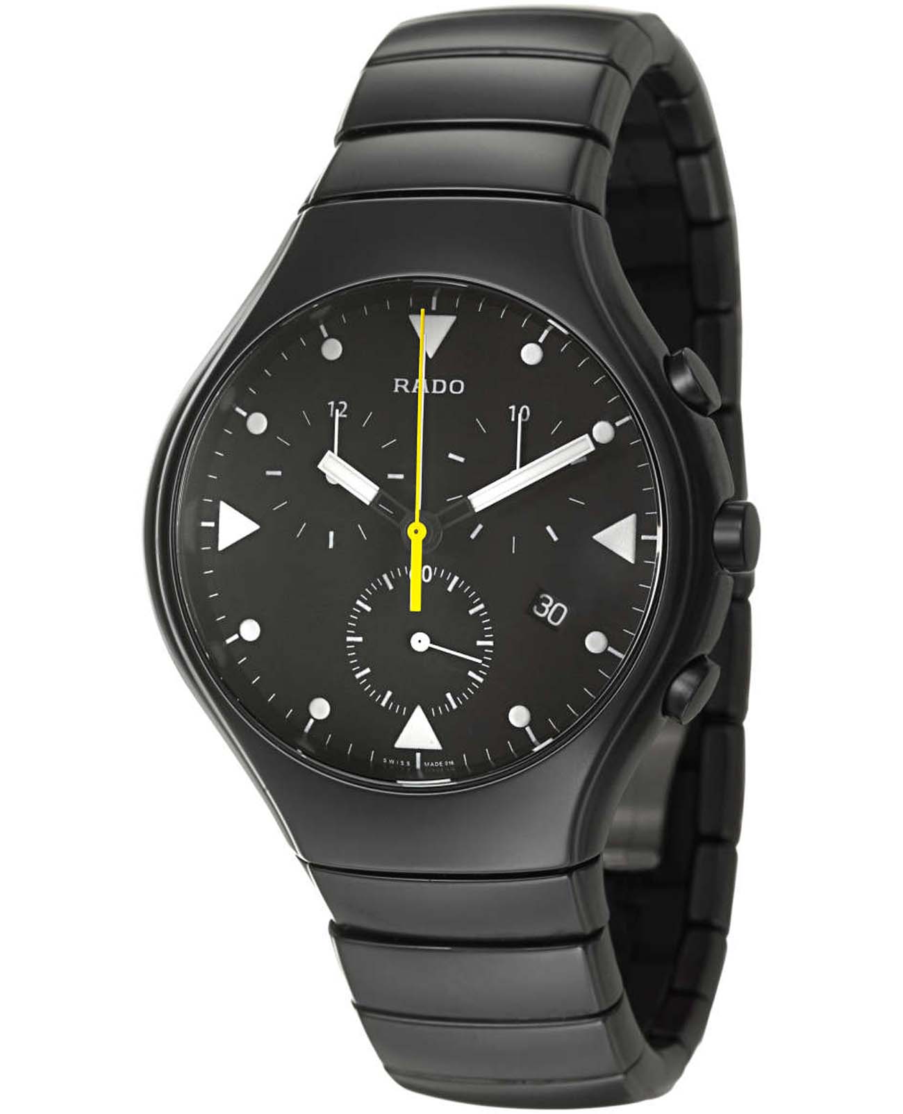 Мужские швейцарские часы-хронографХронографФункция позволяет измерять отрезки времени с особой точностью: часы, минуты, секунды. Верным признаком хронографа является наличие на циферблате 3 дополнительных окошек-счётчиков. Rado True R27815162. Сапфировое стеклоСапфировое стеклоПрочный и надёжный материал из кристалла сапфира синтетического происхождения, характеризующийся особой твёрдостью и устойчивостью к царапинам и повреждениям. устойчивое к мелким механическим повреждениям. Корпус часов изготовлен из высокотехнологичной керамикиВысокотехнологичная керамикаИнновационный запатентованный Rado материал с гладкой или матовой поверхностью. Керамика за счёт кристаллической структуры обладает повышенной устойчивостью от возникновения царапин. Материал способен принимать температуру тела человека, обеспечивая невероятный комфорт при ношении.. Класс водозащиты: 30 метров, позволит защитить корпус от случайных брызг или капель дождя. Браслет из высокотехнологичной керамикиВысокотехнологичная керамикаИнновационный запатентованный Rado материал с гладкой или матовой поверхностью. Керамика за счёт кристаллической структуры обладает повышенной устойчивостью от возникновения царапин. Материал способен принимать температуру тела человека, обеспечивая невероятный комфорт при ношении. на застёжке-бабочке с кнопкамиЗастёжка "бабочка"Такой вид застёжки дополняется предохранителями, помогающими избежать случайного раскрытия браслета. Обладают изящным исполнением. .