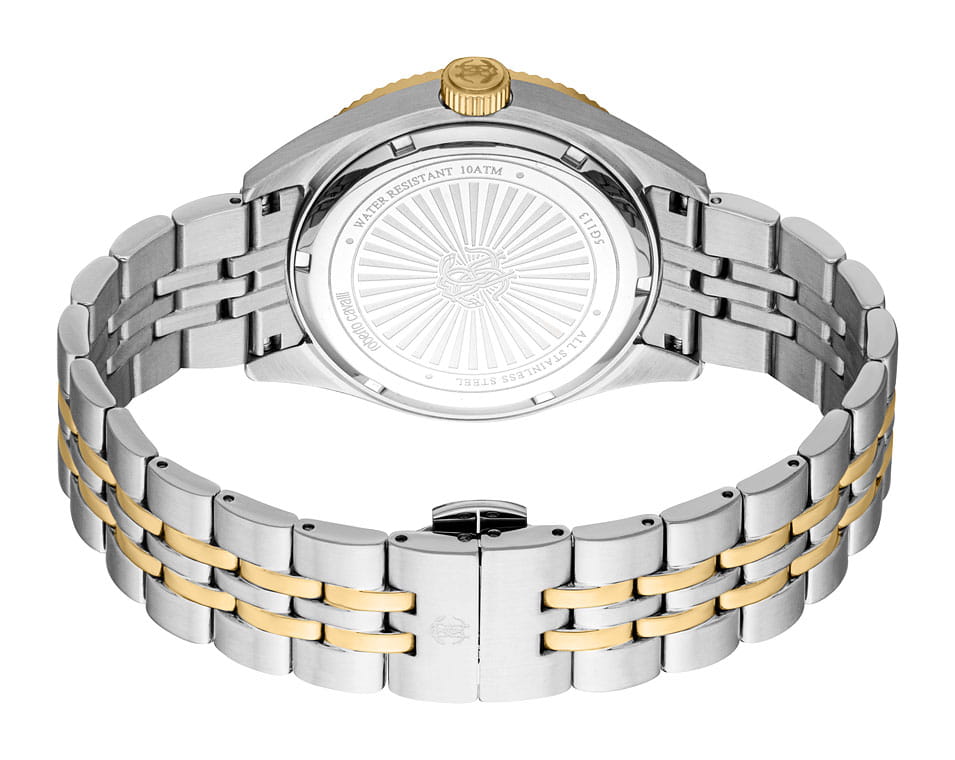 Погрузитесь в мир роскоши и безупречного стиля с мужскими наручными часами ROBERTO CAVALLI RC5G113M0075. Эти часы – воплощение смелого дизайна и итальянской элегантности, созданные для мужчины, который ценит внимание к деталям и не боится заявить о себе. Круглый корпус диаметром 40 мм выполнен из нержавеющей стали, толщина корпуса составляет 11 мм, что придает модели выразительный внешний вид и надежную защиту от внешних воздействий. Циферблат, искусно оформленный фирменными элементами Roberto Cavalli, притягивает взгляд и подчеркивает ваш безупречный вкус. Часы оснащены кварцевым механизмом, также обладают функцией отображения даты, что делает их удобными для ежедневного использования. Минеральное стеклоМинеральное стеклоМинеральное стекло представляет собой искусственно выращенный минерал кварца. Такое стекло отличается особой устойчивостью к повреждениям и царапинам. Уступает по некоторым качествам сапфировому стеклу. защищает часы от царапин. Водозащита 100 метров, позволит плавать, нырять и заниматься другими водными видами спорта. Стальной браслет с частичным PVD-покрытиемPVDУльтратонкое покрытие наносится в технике вакуумного напыления, сочетает в себе нитрид титана особой прочности со слоем золота или оксида хрома. Несёт в себе декоративную или защитную функцию. на застёжке-бабочке с кнопкамиЗастёжка "бабочка"Такой вид застёжки дополняется предохранителями, помогающими избежать случайного раскрытия браслета. Обладают изящным исполнением. обеспечивает комфортное ношение. Рифленый безельБезельВнешний ободок, закрепляющий стекло. В спортивных часах так называется поворотное кольцо с делениями на циферблате, выполняет роль таймера – замеряет отрезки времени на шкале. Неподвижный безель – элемент декора. Однонаправленно вращающийся безель на дайверских часах позволяет фиксировать моменты погружения и выныривания на поверхность. с PVD-покрытиемPVDУльтратонкое покрытие наносится в технике вакуумного напыления, сочетает в себе нитрид титана особой прочности со слоем золота или оксида хрома. Несёт в себе декоративную или защитную функцию.. Стрелки с люминесцентным покрытиемЛюминесцентное покрытиеПозволяет считывать показания времени в темноте. Производители наносят на стрелки, часовые индексы, безель или поверхность циферблата светонакопительный состав, дающий холодное свечение. обеспечивают отличную читаемость в любое время суток.