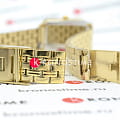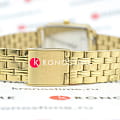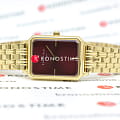 Циферблат бордового цвета с золотистыми стрелками и метками подчёркивает элегантность дизайна. Золотой браслет из нержавеющей стали с PVD-покрытиемPVDУльтратонкое покрытие наносится в технике вакуумного напыления, сочетает в себе нитрид титана особой прочности со слоем золота или оксида хрома. Несёт в себе декоративную или защитную функцию. и пятизвенным звеном обеспечивает удобство и стиль. Браслет оснащён раскладной застёжкойРаскладная застёжкаТакой тип застёжки используется только на браслетах из металла. Она никогда не раскрывается полностью, происходит разделение на 2 и более частей. Раскладывающая застёжка снизит вероятность потери часов к минимуму..