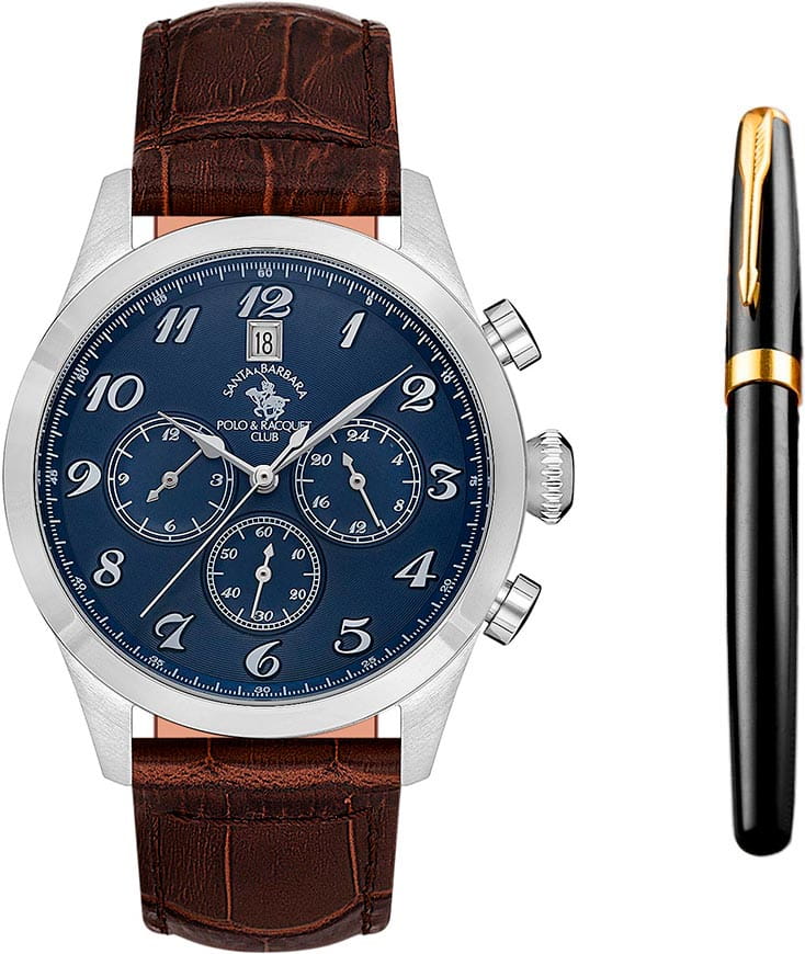 Мужские кварцевые Santa Barbara Polo & Racquet Club SB.1.10551-2 — воплощение элегантности и технического совершенства. Корпус из нержавеющей стали серебристого цвета, диаметром 43 мм, что делает их устойчивыми к внешним воздействиям и придает благородный вид. Циферблат украшен фирменным логотипом и защищён минеральным стекломМинеральное стеклоМинеральное стекло представляет собой искусственно выращенный минерал кварца. Такое стекло отличается особой устойчивостью к повреждениям и царапинам. Уступает по некоторым качествам сапфировому стеклу., устойчивое к царапинам и механическим повреждениям. Кожаный ремешок на стандартной застежке обеспечивает комфортное и безопасное ношение. Рифленая заводная головка. 12-ти и 24-х часовой формат. Окошко даты находится в положении 12 часов. Водонепроницаемость 50 метров позволит защитить корпус от случайных брызг или капель дождя. Идеальный выбор для тех, кто ценит элегантный дизайн и качество. Подарочный набор - функциональные мужские часы и ручка.