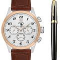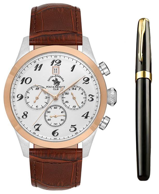 Мужские кварцевые Santa Barbara Polo & Racquet Club SB.1.10551-4 — воплощение элегантности и технического совершенства. Корпус из нержавеющей стали серебристого цвета, диаметром 43 мм, что делает их устойчивыми к внешним воздействиям и придает благородный вид. Циферблат украшен фирменным логотипом и защищён минеральным стекломМинеральное стеклоМинеральное стекло представляет собой искусственно выращенный минерал кварца. Такое стекло отличается особой устойчивостью к повреждениям и царапинам. Уступает по некоторым качествам сапфировому стеклу., устойчивое к царапинам и механическим повреждениям. Кожаный ремешок на стандартной застежке обеспечивает комфортное и безопасное ношение. Неподвижный безельБезельВнешний ободок, закрепляющий стекло. В спортивных часах так называется поворотное кольцо с делениями на циферблате, выполняет роль таймера – замеряет отрезки времени на шкале. Неподвижный безель – элемент декора. Однонаправленно вращающийся безель на дайверских часах позволяет фиксировать моменты погружения и выныривания на поверхность. с IP-покрытиемIP-покрытиеМетод ионного напыления. Демонстрирует повышенную устойчивость к истиранию, окислению и химическим веществам. Под воздействием высокого давления и температуры около 1500°C молекулы металла надёжно соединяются с частицами корпуса часов. цвета розового золота. Рифленая заводная головка. 12-ти и 24-х часовой формат. Окошко даты находится в положении 12 часов. Водонепроницаемость 50 метров позволит защитить корпус от случайных брызг или капель дождя. Идеальный выбор для тех, кто ценит элегантный дизайн и качество. Подарочный набор - функциональные мужские часы и ручка.