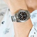 Мужские наручные часы Seiko Prospex SNE571P1 из коллекции Prospex сочетают в себе спортивный дизайн и надежность современных технологий. Модель обладает круглым корпусом диаметром 38,5 мм, изготовленным из нержавеющей стали, что обеспечивает высокую устойчивость к внешним воздействиям . Защита циферблата выполнена с использованием сапфирового стеклаСапфировое стеклоПрочный и надёжный материал из кристалла сапфира синтетического происхождения, характеризующийся особой твёрдостью и устойчивостью к царапинам и повреждениям., устойчивого к появлению царапин и обладающего высокой прозрачностью . БезельБезельВнешний ободок, закрепляющий стекло. В спортивных часах так называется поворотное кольцо с делениями на циферблате, выполняет роль таймера – замеряет отрезки времени на шкале. Неподвижный безель – элемент декора. Однонаправленно вращающийся безель на дайверских часах позволяет фиксировать моменты погружения и выныривания на поверхность. с PVD-покрытиемPVDУльтратонкое покрытие наносится в технике вакуумного напыления, сочетает в себе нитрид титана особой прочности со слоем золота или оксида хрома. Несёт в себе декоративную или защитную функцию.. Часы оснащены системой Solar, которая не требует замены батарейки и обеспечивает запас хода до 10 месяцев при полной зарядке аккумулятора . Кварцевый механизм с калибром V147 гарантирует высокую точность работы, а функция EOLEOLПредставляет собой систему, уведомляющую владельца часов о необходимости замены элемента питания. За 2 недели до полного разряда батарейки секундная стрелка перестаёт ходить чётко и начинает перепрыгивать на 3-4 деления. позволяет контролировать уровень заряда аккумулятора . Циферблат дополнен люминесцентным покрытиемЛюминесцентное покрытиеПозволяет считывать показания времени в темноте. Производители наносят на стрелки, часовые индексы, безель или поверхность циферблата светонакопительный состав, дающий холодное свечение., обеспечивающим видимость в темное время суток . Водонепроницаемость модели достигает 200 метров, что делает ее подходящей для плавания, ныряния и других водных видов спорта .