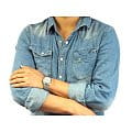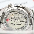 Наручные часы выполнены в классическом стиле, спортивные элементы делают акцент на надёжности и функциональности модели. Традиционный характер выражается в оснащении аксессуара японским механизмом Seiko 7S26 с возможностью ручного и автоматического завода. Калибр отличается сохранением запаса хода на 40 часов, его работу можно отследить через прозрачную завинчивающуюся заднюю крышку. В качестве основного материала была выбрана хирургическая сталь 316L, характеризующаяся устойчивостью к царапинам, повреждениям. Защиту циферблата обеспечивает прочное минеральное стеклоМинеральное стеклоМинеральное стекло представляет собой искусственно выращенный минерал кварца. Такое стекло отличается особой устойчивостью к повреждениям и царапинам. Уступает по некоторым качествам сапфировому стеклу. Hardlex. На стрелки нанесено люминесцентное покрытиеЛюминесцентное покрытиеПозволяет считывать показания времени в темноте. Производители наносят на стрелки, часовые индексы, безель или поверхность циферблата светонакопительный состав, дающий холодное свечение.. Водостойкость при давлении до 5 бар позволяет принимать душ в часах, они выдержат дождь или мойку машины. На позиции 3 часов размещено окошко даты и дня недели. Диаметр корпуса: 38 мм.