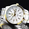 Элегантный аксессуар в биколорном исполнении стильно смотрится на широком мужском запястье, выгодно подчёркивая ваш тонкий вкус. БезельБезельВнешний ободок, закрепляющий стекло. В спортивных часах так называется поворотное кольцо с делениями на циферблате, выполняет роль таймера – замеряет отрезки времени на шкале. Неподвижный безель – элемент декора. Однонаправленно вращающийся безель на дайверских часах позволяет фиксировать моменты погружения и выныривания на поверхность. с PVD-покрытиемPVDУльтратонкое покрытие наносится в технике вакуумного напыления, сочетает в себе нитрид титана особой прочности со слоем золота или оксида хрома. Несёт в себе декоративную или защитную функцию.. Светлый циферблат с золотистыми стрелками и метками обеспечивает идеальную читаемость данных, он защищён минеральным стекломМинеральное стеклоМинеральное стекло представляет собой искусственно выращенный минерал кварца. Такое стекло отличается особой устойчивостью к повреждениям и царапинам. Уступает по некоторым качествам сапфировому стеклу. Hardlex с закаленной поверхностью. Абсолютная точность хода достигается благодаря автоматическому японскому механизму 7S26, запас хода которого рассчитан на 40 часов. Прозрачная задняя крышка позволяет наблюдать за движением деталей калибра. Часы устойчивы к воздействию магнитного поля, прочные корпус и браслет сделаны из стали 316L с частичным PVD-покрытиемPVDУльтратонкое покрытие наносится в технике вакуумного напыления, сочетает в себе нитрид титана особой прочности со слоем золота или оксида хрома. Несёт в себе декоративную или защитную функцию.. Стрелки имеют люминесцентную подсветкуЛюминесцентное покрытиеПозволяет считывать показания времени в темноте. Производители наносят на стрелки, часовые индексы, безель или поверхность циферблата светонакопительный состав, дающий холодное свечение.. На метке 3 часов размещена апертура даты, отображается текущее число и день недели. Диаметр корпуса: 43 мм.