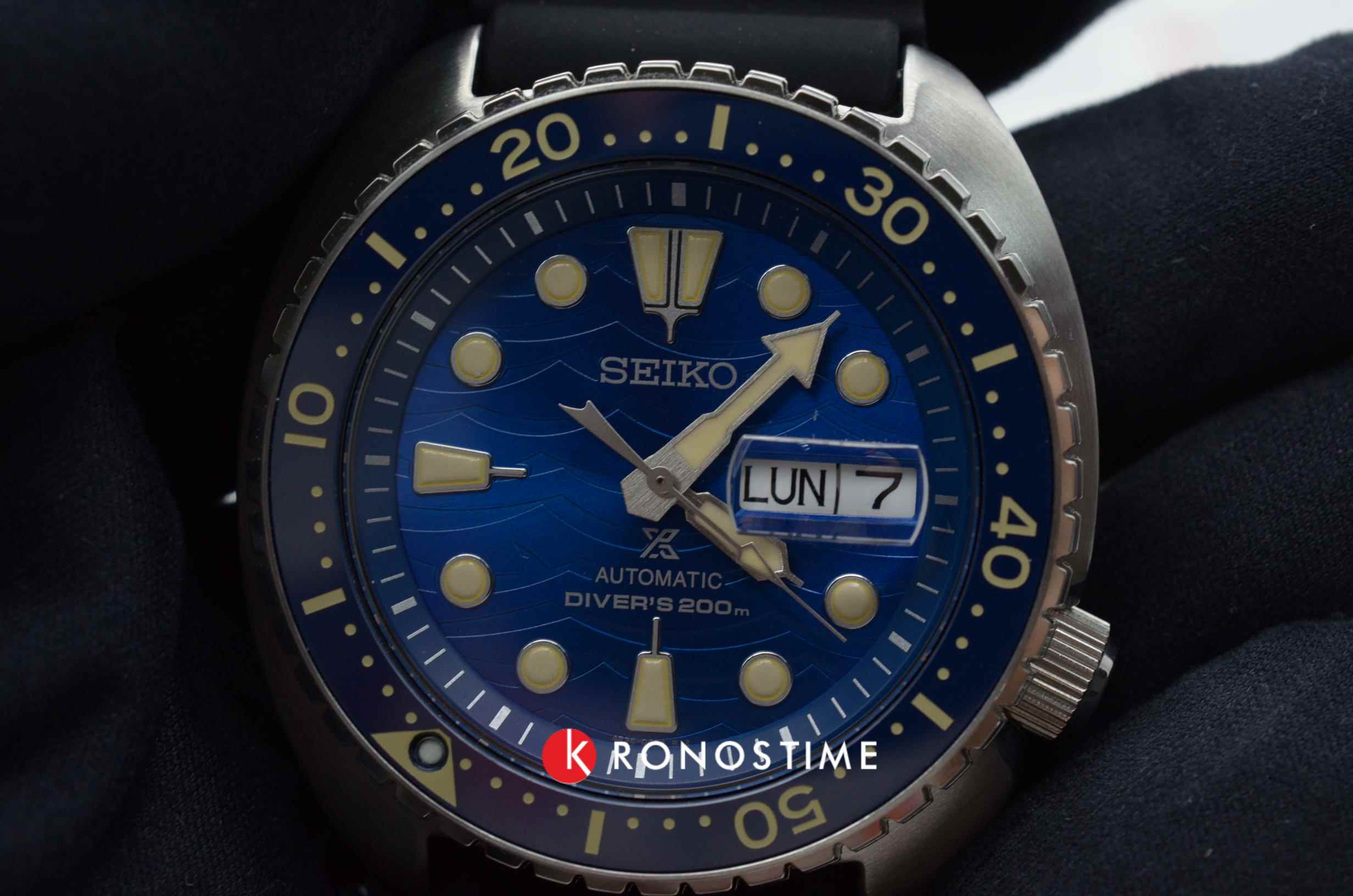 Аксессуар из специальной серии отличается оригинальным дизайном. Чёрный циферблат с узором дополнен метками и стрелками с люминесцентной подсветкойЛюминесцентное покрытиеПозволяет считывать показания времени в темноте. Производители наносят на стрелки, часовые индексы, безель или поверхность циферблата светонакопительный состав, дающий холодное свечение.. Японский автоматический калибр Seiko 4К36 имеет запас хода на 41 час. Корпус выполнен из стали 316L с PVD-покрытиемPVDУльтратонкое покрытие наносится в технике вакуумного напыления, сочетает в себе нитрид титана особой прочности со слоем золота или оксида хрома. Несёт в себе декоративную или защитную функцию.. Рифленая заводная головка защищена, безельБезельВнешний ободок, закрепляющий стекло. В спортивных часах так называется поворотное кольцо с делениями на циферблате, выполняет роль таймера – замеряет отрезки времени на шкале. Неподвижный безель – элемент декора. Однонаправленно вращающийся безель на дайверских часах позволяет фиксировать моменты погружения и выныривания на поверхность. вращается в одном направлении. Индикатор даты отображает число и день недели.