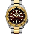 Часы Seiko 5 Sports SRPK24 сочетают в себе элегантный дизайн и надёжность, характерные для японского часового мастерства. Корпус диаметром 42,5 мм выполнен из нержавеющей стали с двухцветным PVD-покрытиемPVDУльтратонкое покрытие наносится в технике вакуумного напыления, сочетает в себе нитрид титана особой прочности со слоем золота или оксида хрома. Несёт в себе декоративную или защитную функцию.: сочетание серебристого и золотистого тонов придаёт часам утончённый вид. Коричневый циферблат защищён минеральным стекломМинеральное стеклоМинеральное стекло представляет собой искусственно выращенный минерал кварца. Такое стекло отличается особой устойчивостью к повреждениям и царапинам. Уступает по некоторым качествам сапфировому стеклу. с повышенной прочностью. ​​