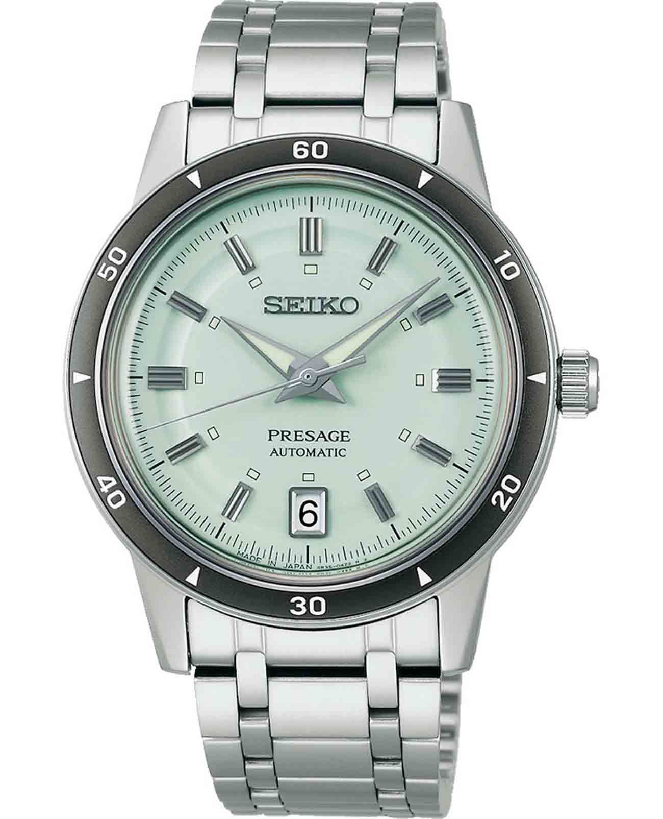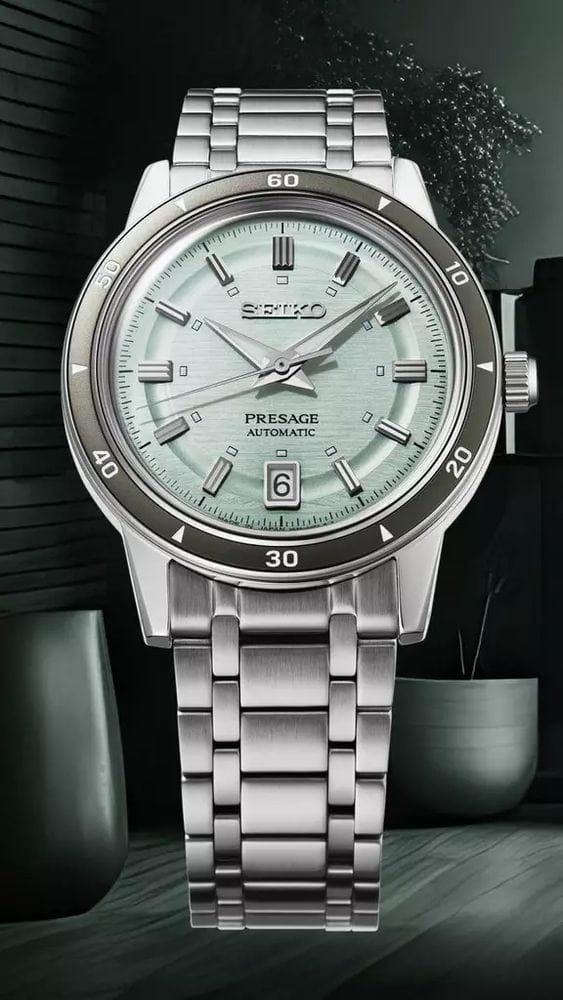 Модель Seiko SRPL71J1 из коллекции Presage Style 60s — это элегантные автоматические часы с ретро-настроением и спокойной эстетикой 1960-х годов. Корпус диаметром 39,5 мм выполнен из нержавеющей стали с комбинированной полировкой, подчёркивая классический силуэт модели. Водозащита — до 50 метров, что делает часы удобными для повседневного использования. Фиксированный алюминиевый безельБезельВнешний ободок, закрепляющий стекло. В спортивных часах так называется поворотное кольцо с делениями на циферблате, выполняет роль таймера – замеряет отрезки времени на шкале. Неподвижный безель – элемент декора. Однонаправленно вращающийся безель на дайверских часах позволяет фиксировать моменты погружения и выныривания на поверхность. с минутной разметкой подчёркивает винтажный стиль. Светло-зелёный циферблат с фактурной поверхностью дополнен аккуратными метками и стрелками с люминесцентным покрытиемЛюминесцентное покрытиеПозволяет считывать показания времени в темноте. Производители наносят на стрелки, часовые индексы, безель или поверхность циферблата светонакопительный состав, дающий холодное свечение. LumiBrite, обеспечивающим читаемость в тёмное время суток. Циферблат защищён выпуклым стеклом Hardlex, которое имитирует эффект винтажного купольного стекла. Внутри установлен надёжный автоматический калибр Seiko 4R35 с функцией ручного подзавода, остановкой секундной стрелки и индикацией даты. Запас хода составляет около 41 часа. Браслет выполнен из нержавеющей стали с 5-звеньевой конструкцией и снабжён удобной раскладной застёжкойРаскладная застёжкаТакой тип застёжки используется только на браслетах из металла. Она никогда не раскрывается полностью, происходит разделение на 2 и более частей. Раскладывающая застёжка снизит вероятность потери часов к минимуму. с кнопками. Seiko SRPL71J1 — это изысканные повседневные часы, в которых сочетаются винтажный облик, современная механика и продуманное исполнение.