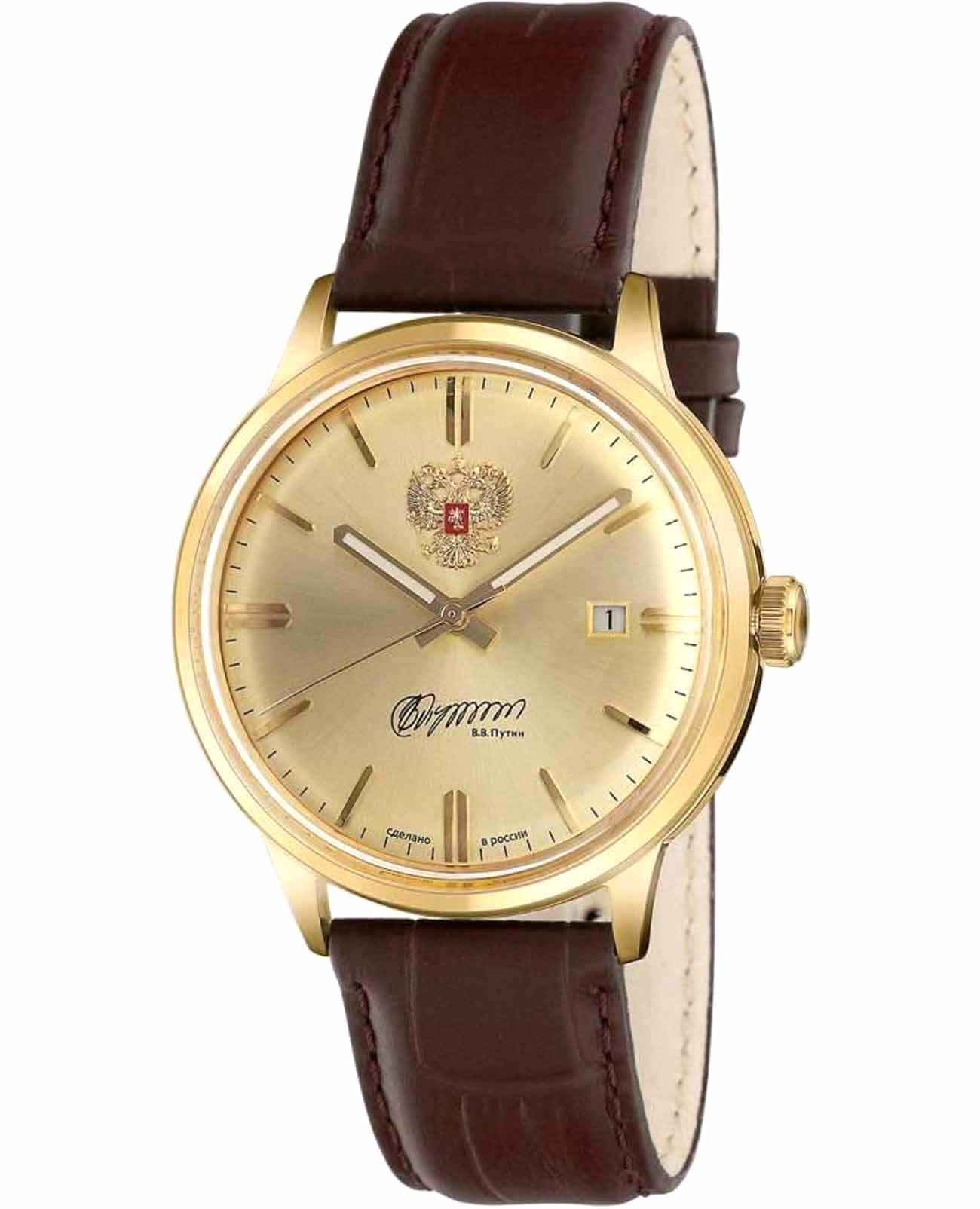 Российские механические наручные часы Слава 1459055/8215-300, которые станут идеальным аксессуаром для повседневного ношения. Эти часы сочетают в себе элегантность и практичность, предлагая безупречный стиль и надежность. Оснащенные механизмом Miyota 8215 с автоподзаводом, они обеспечивают точность и долговечность, поддерживая запас хода до 42 часов. Стальной корпус с IP-покрытиемIP-покрытиеМетод ионного напыления. Демонстрирует повышенную устойчивость к истиранию, окислению и химическим веществам. Под воздействием высокого давления и температуры около 1500°C молекулы металла надёжно соединяются с частицами корпуса часов. и минеральным стекломМинеральное стеклоМинеральное стекло представляет собой искусственно выращенный минерал кварца. Такое стекло отличается особой устойчивостью к повреждениям и царапинам. Уступает по некоторым качествам сапфировому стеклу. защищает золотистый циферблат, выполненный по технологии Sunray. Стрелки в стиле Baton с люминесцентным покрытиемЛюминесцентное покрытиеПозволяет считывать показания времени в темноте. Производители наносят на стрелки, часовые индексы, безель или поверхность циферблата светонакопительный состав, дающий холодное свечение. облегчают чтение времени даже в условиях слабого освещения. На циферблате изображены герб Российской Федерации и автограф В.В. Путина. Часы также имеют календарь с окошком даты на 3 часах и водозащиту до 50WR, что делает их надежными в различных условиях. Текстурированный кожаный ремешок с классической застежкой завершает этот изысканный образ.