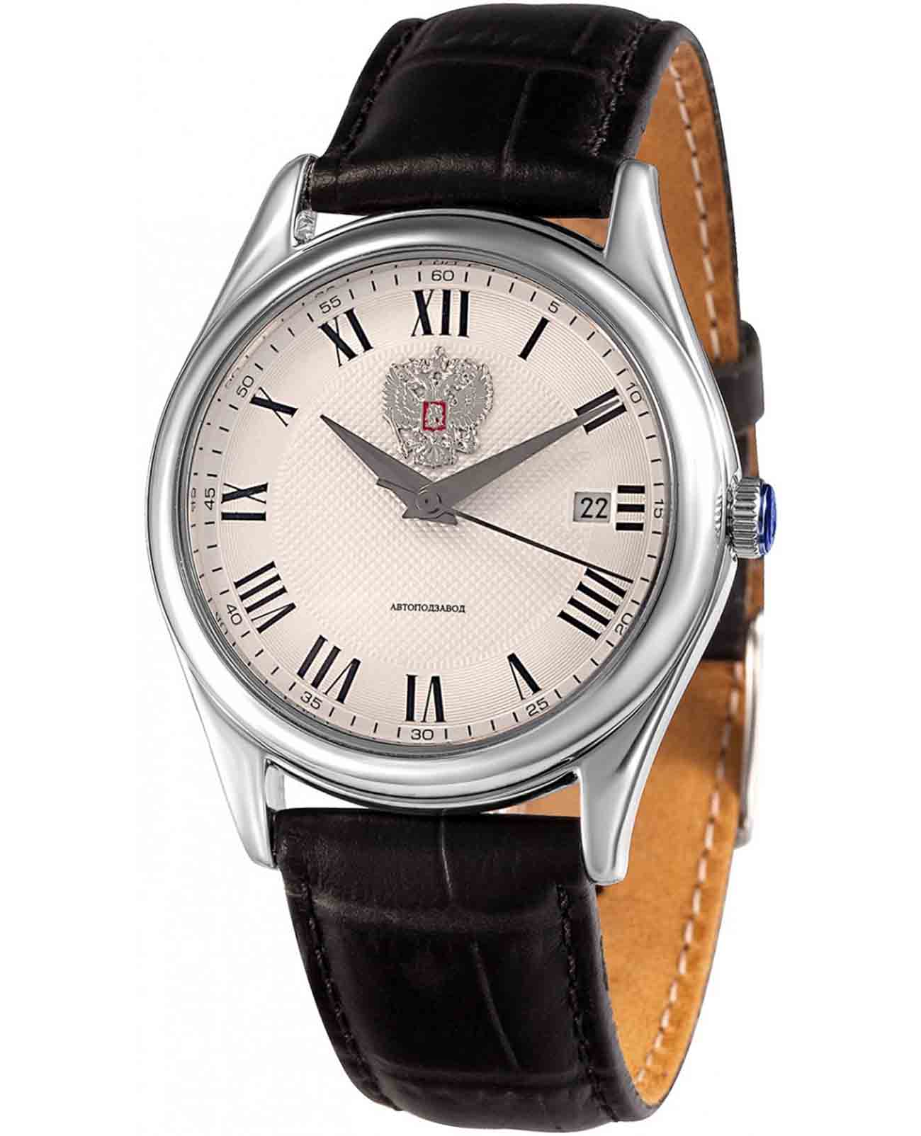 Российские механические наручные часы Слава Сенат 1490867/300-8215, которые станут идеальным аксессуаром для повседневного ношения. Эти часы сочетают в себе элегантность и практичность, предлагая безупречный стиль и надежность. Оснащенные механизмом Miyota 8215 с автоподзаводом, они обеспечивают точность и долговечность, поддерживая запас хода до 42 часов. Стальной корпус с сапфировым стекломСапфировое стеклоПрочный и надёжный материал из кристалла сапфира синтетического происхождения, характеризующийся особой твёрдостью и устойчивостью к царапинам и повреждениям. защищает циферблат цвета слоновой кости с римскими цифрами. На циферблате изображены герб Российской Федерации. Часы также имеют календарь с окошком даты на 3 часах и водозащиту до 50WR, что делает их надежными в различных условиях. Текстурированный кожаный ремешок с классической застежкой завершает этот изысканный образ.