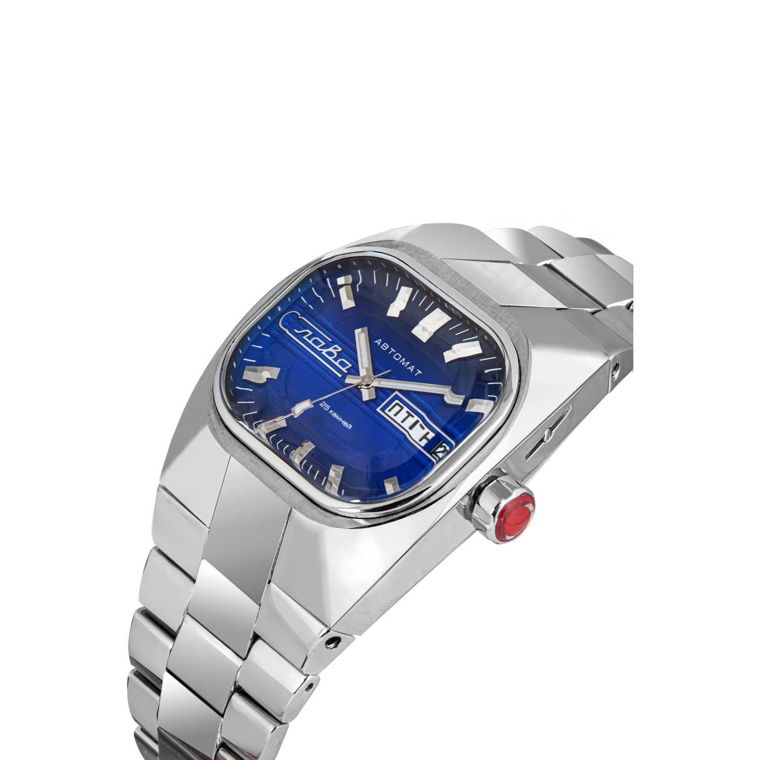Часы Слава Танк 4320688/100-2427 — это элегантное сочетание ретро стиля и современных технологий, способное подчеркнуть изысканный вкус владельца и дополнить любой образ. Эта лимитированная серия, состоящая из 300 экземпляров, является современной интерпретацией легендарного выпуска часов, созданного специально для делегатов XXV съезда КПСС в 1975 году. Механизм часов с автоподзаводом оснащен калибром «Слава 2427». Запас хода составляет 31 час, что обеспечивает надежность и долговечность в использовании. Корпус и браслет с застежкой «бабочка»Застёжка "бабочка"Такой вид застёжки дополняется предохранителями, помогающими избежать случайного раскрытия браслета. Обладают изящным исполнением. выполнены из высококачественной стали 904L, придающей модели прочность и устойчивость к внешним воздействиям. Диаметр корпуса составляет 42 мм, а толщина — 13 мм, что делает часы удобными в ношении. Синий циферблат с метками в виде штрихов защищен выпуклым сапфировым стекломСапфировое стеклоПрочный и надёжный материал из кристалла сапфира синтетического происхождения, характеризующийся особой твёрдостью и устойчивостью к царапинам и повреждениям., стойким к царапинам. Стрелки и метки обладают люминесцентным покрытиемЛюминесцентное покрытиеПозволяет считывать показания времени в темноте. Производители наносят на стрелки, часовые индексы, безель или поверхность циферблата светонакопительный состав, дающий холодное свечение., которое светится в темноте после зарядки на свету, обеспечивая отличную видимость в любых условиях. Календарь с указанием числа и дня недели расположен в положении 3 часа, добавляя функциональности модели. Каждые часы имеют индивидуальный серийный номер, выгравированный на боковой части корпуса, что подчеркивает их уникальность. Прозрачная задняя крышка позволяет наблюдать за работой механизма, а надежный стальной браслет с раскладывающейся застежкой обеспечивает комфорт и безопасность при носке. Часы обладают водозащитой 100WR, что делает их идеальными для активного образа жизни.