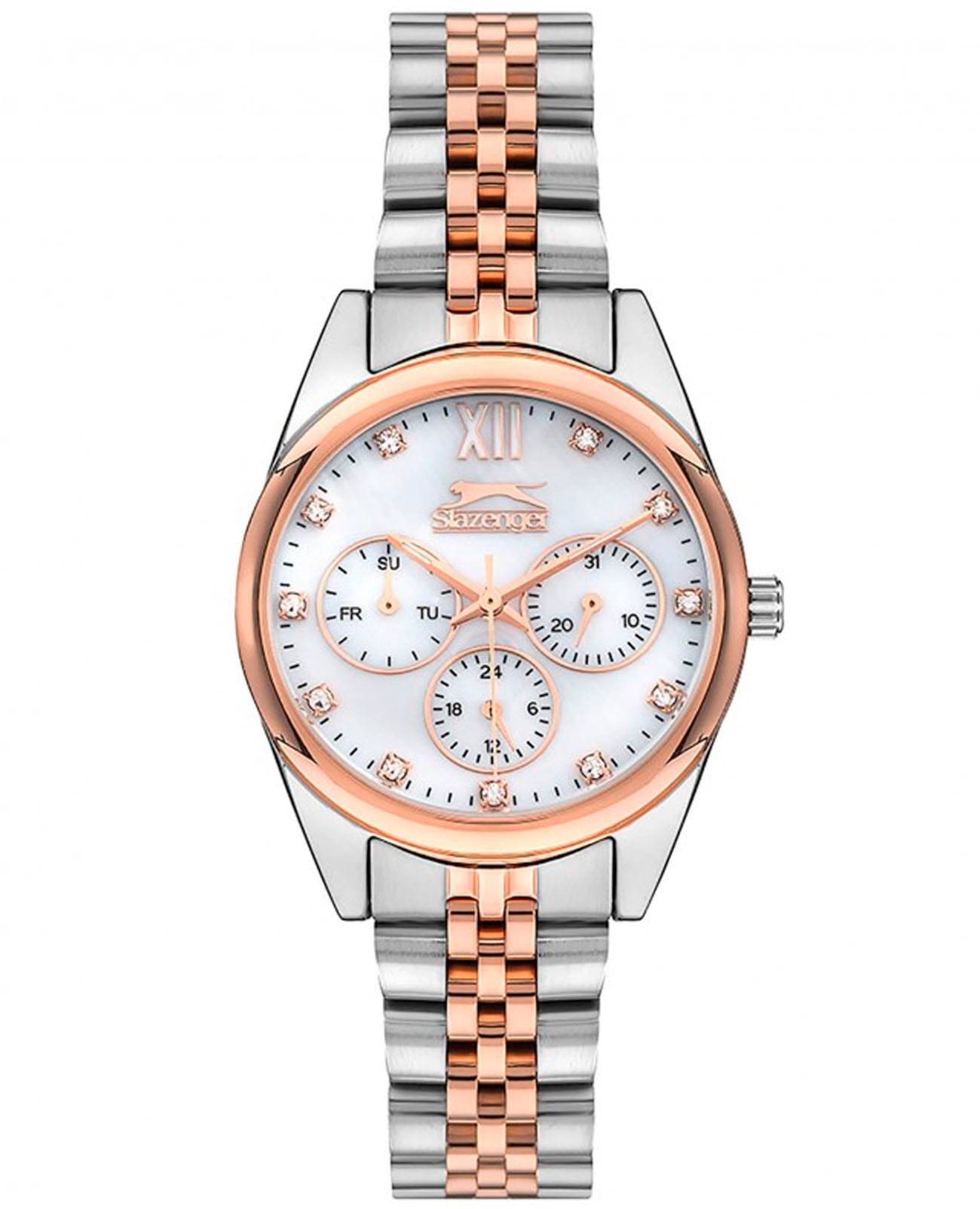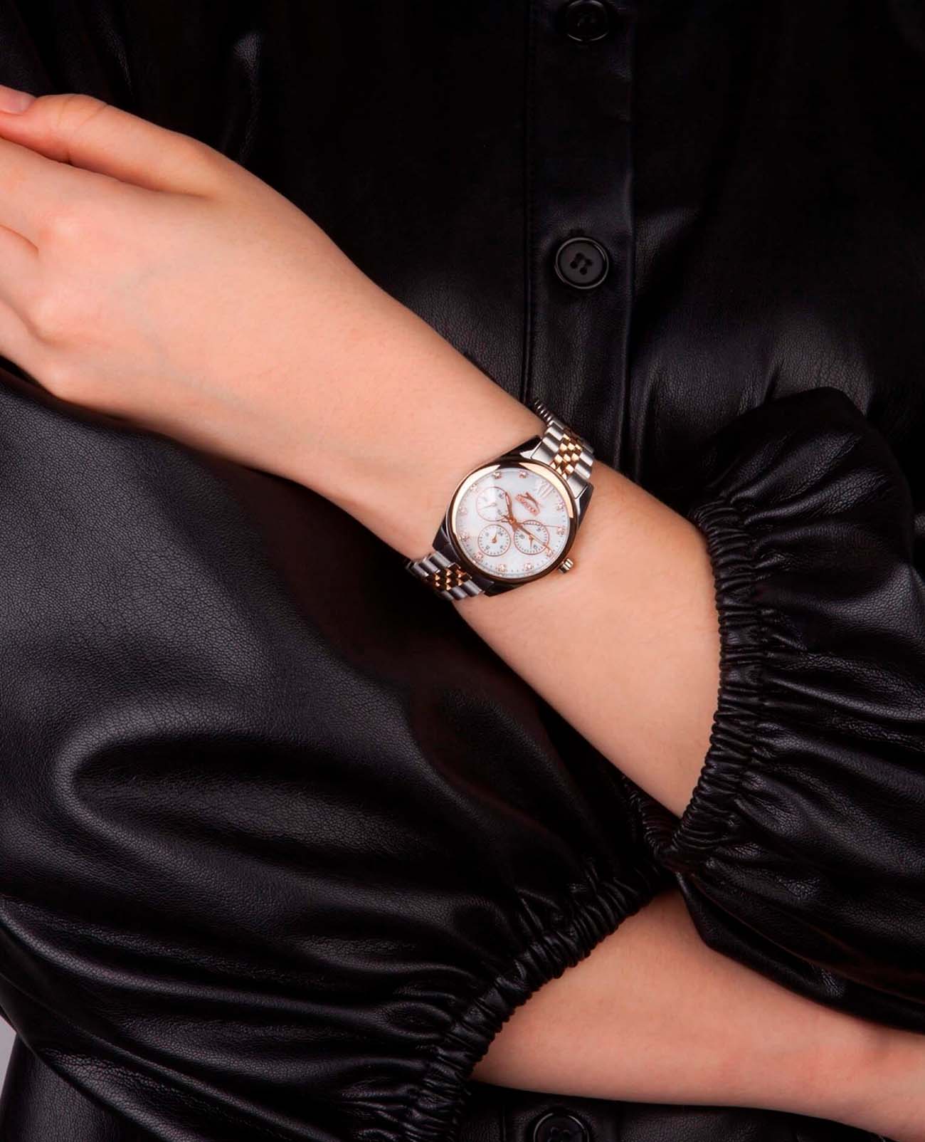 Женские наручные часы Slazenger SL.09.1990.4.01 сочетают в себе элегантный дизайн и практичность современных технологий. Модель обладает круглым корпусом диаметром 34 мм, изготовленным из суперметалла, что обеспечивает высокую устойчивость к внешним воздействиям. БезельБезельВнешний ободок, закрепляющий стекло. В спортивных часах так называется поворотное кольцо с делениями на циферблате, выполняет роль таймера – замеряет отрезки времени на шкале. Неподвижный безель – элемент декора. Однонаправленно вращающийся безель на дайверских часах позволяет фиксировать моменты погружения и выныривания на поверхность. с IP-покрытиемIP-покрытиеМетод ионного напыления. Демонстрирует повышенную устойчивость к истиранию, окислению и химическим веществам. Под воздействием высокого давления и температуры около 1500°C молекулы металла надёжно соединяются с частицами корпуса часов. Браслет выполнен из того же материала на раскладной застёжкеРаскладная застёжкаТакой тип застёжки используется только на браслетах из металла. Она никогда не раскрывается полностью, происходит разделение на 2 и более частей. Раскладывающая застёжка снизит вероятность потери часов к минимуму., гарантирующей комфортное ношение. Белый циферблат оснащен индексами для лучшей читаемости времени и дополнен функцией календаря. Для защиты применяется минеральное стеклоМинеральное стеклоМинеральное стекло представляет собой искусственно выращенный минерал кварца. Такое стекло отличается особой устойчивостью к повреждениям и царапинам. Уступает по некоторым качествам сапфировому стеклу., обеспечивающее прочную защиту от царапин. Часы работают на японском кварцевом механизме, что гарантирует точное время без необходимости подзаводки. Водонепроницаемость составляет 3 атмосферы (30 метров), что позволяет использовать их в повседневной жизни, но не рекомендуется для плавания или занятий водными видами спорта.