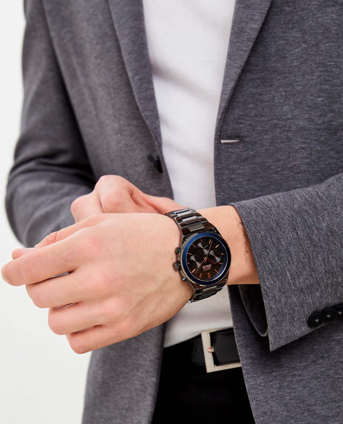 Мужские наручные часы Slazenger SL.09.2027.2.03 сочетают в себе классический дизайн и надежность современных технологий. Модель обладает круглым корпусом диаметром 45 мм, изготовленным из суперметалла с IP-покрытиемIP-покрытиеМетод ионного напыления. Демонстрирует повышенную устойчивость к истиранию, окислению и химическим веществам. Под воздействием высокого давления и температуры около 1500°C молекулы металла надёжно соединяются с частицами корпуса часов., что обеспечивает высокую устойчивость к внешним воздействиям. Браслет выполнен из того же материала с раскладной застежкойРаскладной замокДанный вариант застежки используется только на часах с металлическим браслетом. Отличительная особенность такого крепления в том, что длина браслета становится универсальной и вы можете самостоятельно отрегулировать нужный вам размер – застежка просто двигается по браслету часов., гарантирующей комфортное ношение и безопасность. БезельБезельВнешний ободок, закрепляющий стекло. В спортивных часах так называется поворотное кольцо с делениями на циферблате, выполняет роль таймера – замеряет отрезки времени на шкале. Неподвижный безель – элемент декора. Однонаправленно вращающийся безель на дайверских часах позволяет фиксировать моменты погружения и выныривания на поверхность. с IP-покрытиемIP-покрытиеМетод ионного напыления. Демонстрирует повышенную устойчивость к истиранию, окислению и химическим веществам. Под воздействием высокого давления и температуры около 1500°C молекулы металла надёжно соединяются с частицами корпуса часов.. Серый циферблат оснащен тремя стрелками для показания часов, минут и секунд. Для защиты применяется минеральное стеклоМинеральное стеклоМинеральное стекло представляет собой искусственно выращенный минерал кварца. Такое стекло отличается особой устойчивостью к повреждениям и царапинам. Уступает по некоторым качествам сапфировому стеклу., устойчивое к царапинам. Часы работают на кварцевом механизме, что гарантирует точное время без необходимости подзаводки. Водонепроницаемость часов достигает 5 атмосфер (50 метров), что позволяет использовать их при контакте с водой, например, во время мытья рук или попадания брызг, однако не рекомендуется для плавания.