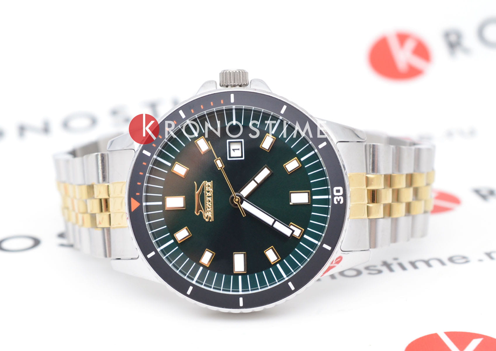Часы Slazenger SL.09.2135.1.04 воплощают в себе элегантность и практичность, идеально подходящие для современных мужчин. Их зеленый циферблат, защищенный минеральным стекломМинеральное стеклоМинеральное стекло представляет собой искусственно выращенный минерал кварца. Такое стекло отличается особой устойчивостью к повреждениям и царапинам. Уступает по некоторым качествам сапфировому стеклу., заключен в серебристый корпус диаметром 45 мм, который изготовлен из прочного суперметалла. Неподвижный безельБезельВнешний ободок, закрепляющий стекло. В спортивных часах так называется поворотное кольцо с делениями на циферблате, выполняет роль таймера – замеряет отрезки времени на шкале. Неподвижный безель – элемент декора. Однонаправленно вращающийся безель на дайверских часах позволяет фиксировать моменты погружения и выныривания на поверхность. с IP-покрытиемIP-покрытиеМетод ионного напыления. Демонстрирует повышенную устойчивость к истиранию, окислению и химическим веществам. Под воздействием высокого давления и температуры около 1500°C молекулы металла надёжно соединяются с частицами корпуса часов. черного цвета. Часы оснащены удобным окошком даты и стрелками контрастного цвета. Надежный кварцевый механизм обеспечивает точность, а водозащита 5 ATM делает их устойчивыми к воздействию воды. Стальной браслет из суперметалла с частичным IP-покрытиемIP-покрытиеМетод ионного напыления. Демонстрирует повышенную устойчивость к истиранию, окислению и химическим веществам. Под воздействием высокого давления и температуры около 1500°C молекулы металла надёжно соединяются с частицами корпуса часов. золотистого цвета имеет раскладную застёжкуРаскладная застёжкаТакой тип застёжки используется только на браслетах из металла. Она никогда не раскрывается полностью, происходит разделение на 2 и более частей. Раскладывающая застёжка снизит вероятность потери часов к минимуму., что подчеркивает современный стиль и позволяет легко снимать часы. Люминесцентное покрытиеЛюминесцентное покрытиеПозволяет считывать показания времени в темноте. Производители наносят на стрелки, часовые индексы, безель или поверхность циферблата светонакопительный состав, дающий холодное свечение. на стрелках и метках обеспечивает отличную видимость в темноте.