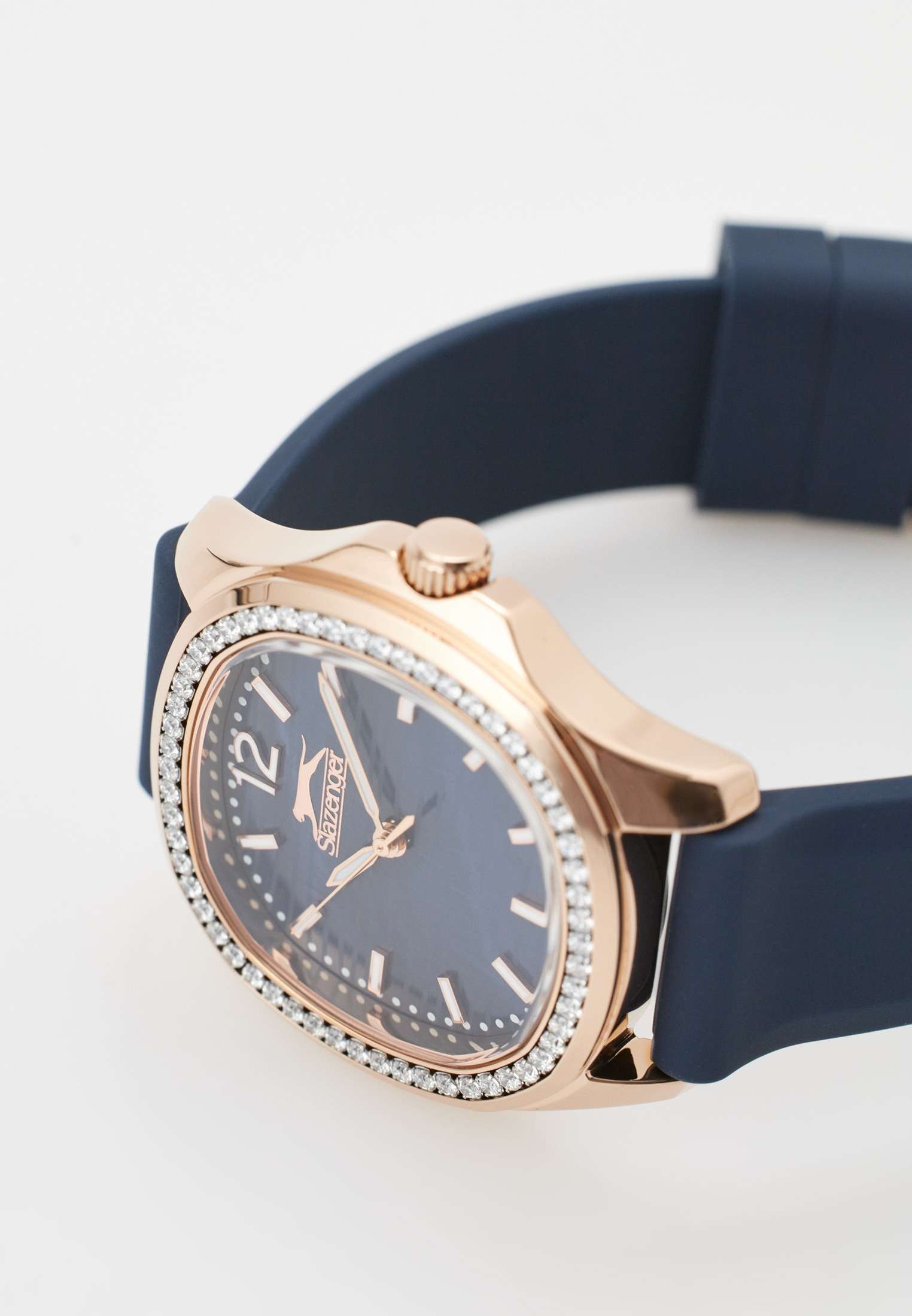 Часы Slazenger SL.09.2239.3.02 – это изысканный аксессуар, который станет стильным акцентом любого образа. Модель оснащена надежным кварцевым механизмом. Корпус из прочного металла с розово-золотистым IP-покрытиемIP-покрытиеМетод ионного напыления. Демонстрирует повышенную устойчивость к истиранию, окислению и химическим веществам. Под воздействием высокого давления и температуры около 1500°C молекулы металла надёжно соединяются с частицами корпуса часов. размером 34х34 мм украшен россыпью сверкающих фианитов по безелюБезельВнешний ободок, закрепляющий стекло. В спортивных часах так называется поворотное кольцо с делениями на циферблате, выполняет роль таймера – замеряет отрезки времени на шкале. Неподвижный безель – элемент декора. Однонаправленно вращающийся безель на дайверских часах позволяет фиксировать моменты погружения и выныривания на поверхность., что придает часам особое сияние и элегантность. Синий циферблат с логотипом бренда защищен стойким к царапинам минеральным стекломМинеральное стеклоМинеральное стекло представляет собой искусственно выращенный минерал кварца. Такое стекло отличается особой устойчивостью к повреждениям и царапинам. Уступает по некоторым качествам сапфировому стеклу.. Четкие часовые метки в виде лаконичных штрихов и крупная арабская цифра 12 обеспечивают удобство чтения времени. Заводная головка с рифлением дополнена защитой для повышения долговечности. Резиновый синий ремешок шириной 18 мм надежно фиксируется на запястье с помощью классической застежки. Для удобства использования в темное время суток предусмотрено люминесцентное покрытиеЛюминесцентное покрытиеПозволяет считывать показания времени в темноте. Производители наносят на стрелки, часовые индексы, безель или поверхность циферблата светонакопительный состав, дающий холодное свечение. стрелок. Водозащита 30WR позволяет не беспокоиться о случайных брызгах. Вес изделия составляет 43 грамма, что делает часы комфортными для ежедневного ношения. Эти часы идеально подойдут для тех, кто ценит гармонию стиля, качества и функциональности.