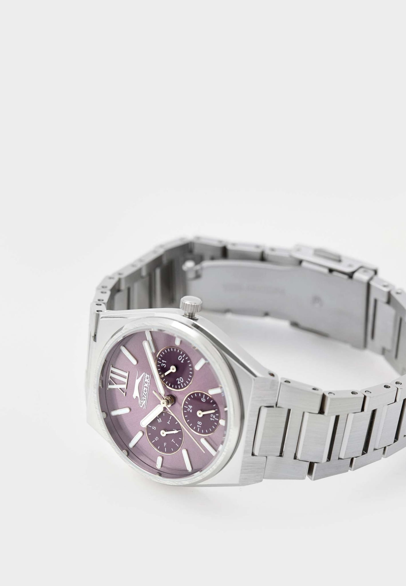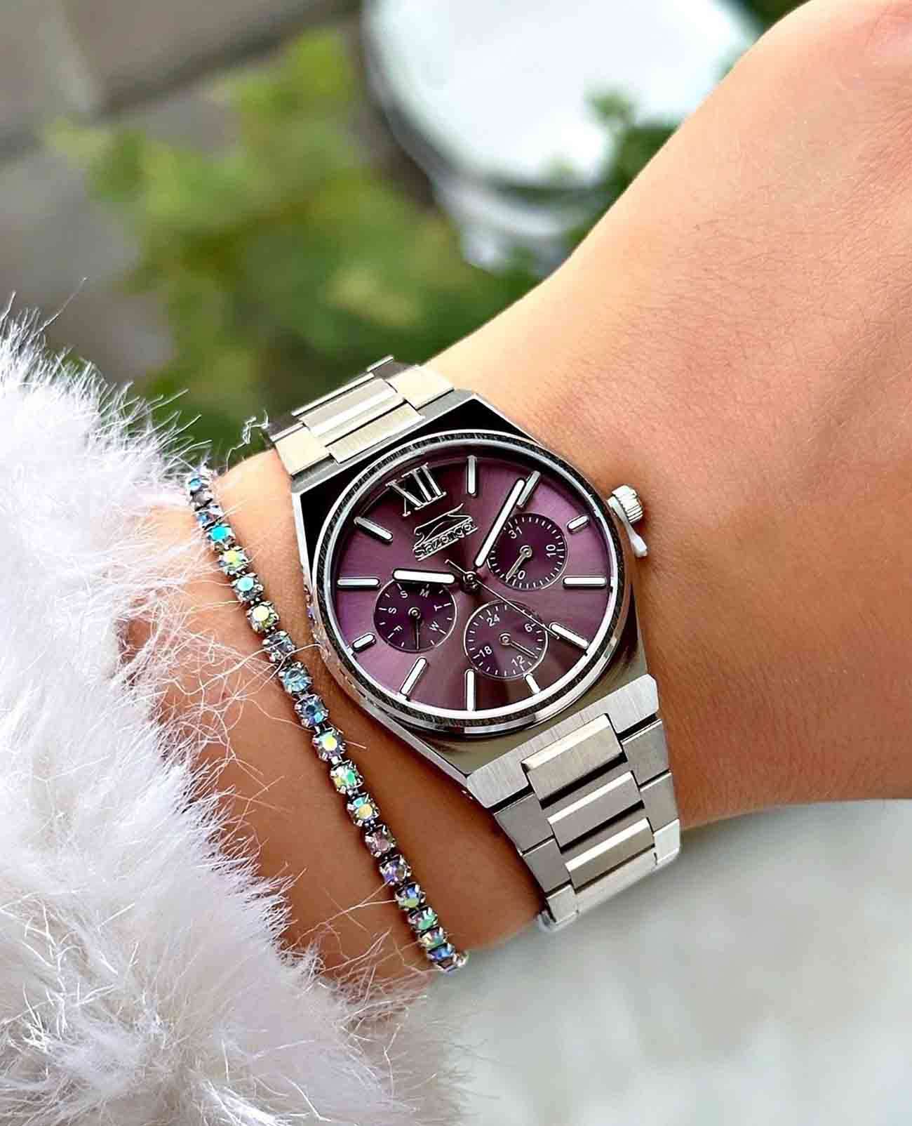 Часы Slazenger SL.09.2243.4.08 сочетают в себе элегантный дизайн и практичность для повседневного использования. Модель выполнена в изысканном серебряном цвете, корпус и браслет изготовлены из прочного металла, что обеспечивает надежность и долговечность изделия. Кварцевый механизм гарантирует точность хода, а минеральное стеклоМинеральное стеклоМинеральное стекло представляет собой искусственно выращенный минерал кварца. Такое стекло отличается особой устойчивостью к повреждениям и царапинам. Уступает по некоторым качествам сапфировому стеклу. защищает фиолетовый циферблат от механических повреждений. Диаметр корпуса составляет 34 мм, толщина — 9 мм, ширина ремешка — 20 мм, а общий вес часов — всего 87 грамм, что делает их легкими и комфортными на руке. Уровень водозащиты WR 30 позволяет не беспокоиться о случайных брызгах. Для удобства использования в темное время суток предусмотрено люминесцентное покрытиеЛюминесцентное покрытиеПозволяет считывать показания времени в темноте. Производители наносят на стрелки, часовые индексы, безель или поверхность циферблата светонакопительный состав, дающий холодное свечение. стрелок и меток. Дополнительные малые циферблаты отображают дату, день недели и время в 24-часовом формате. Часы оснащены металлическим браслетом с надежной раскладной застёжкойРаскладная застёжкаТакой тип застёжки используется только на браслетах из металла. Она никогда не раскрывается полностью, происходит разделение на 2 и более частей. Раскладывающая застёжка снизит вероятность потери часов к минимуму..