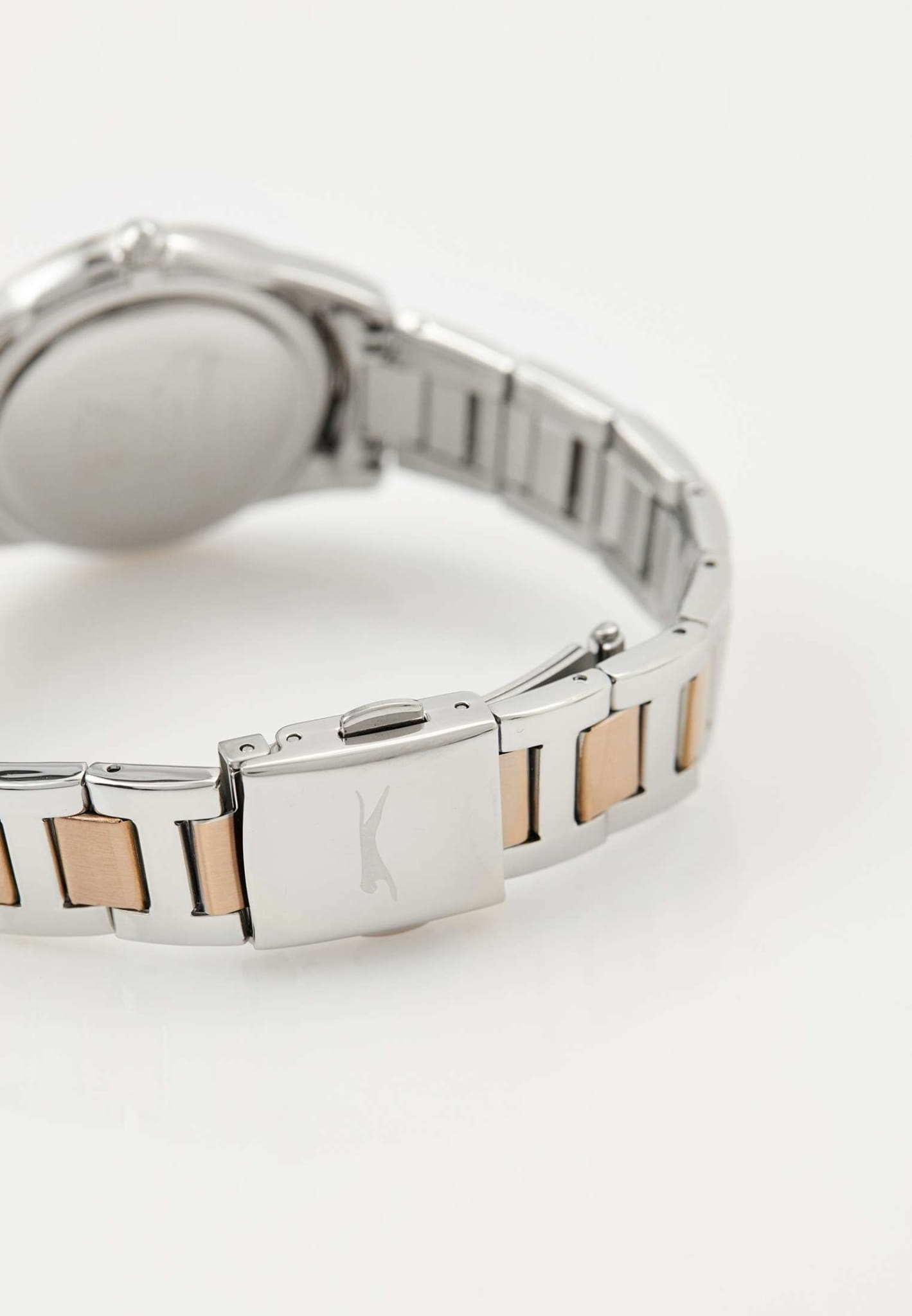 Часы Slazenger SL.09.2253.3.03 — это стильная и элегантная модель, созданная для тех, кто ценит утонченность и надежность. Корпус выполнен из прочного металла, а изящный серебристый браслет с частичным розово-золотистым IP-покрытиемIP-покрытиеМетод ионного напыления. Демонстрирует повышенную устойчивость к истиранию, окислению и химическим веществам. Под воздействием высокого давления и температуры около 1500°C молекулы металла надёжно соединяются с частицами корпуса часов. оснащён удобной раскладной застёжкойРаскладная застёжкаТакой тип застёжки используется только на браслетах из металла. Она никогда не раскрывается полностью, происходит разделение на 2 и более частей. Раскладывающая застёжка снизит вероятность потери часов к минимуму.. На безельБезельВнешний ободок, закрепляющий стекло. В спортивных часах так называется поворотное кольцо с делениями на циферблате, выполняет роль таймера – замеряет отрезки времени на шкале. Неподвижный безель – элемент декора. Однонаправленно вращающийся безель на дайверских часах позволяет фиксировать моменты погружения и выныривания на поверхность. нанесено розово-золотистое IP-покрытиеIP-покрытиеМетод ионного напыления. Демонстрирует повышенную устойчивость к истиранию, окислению и химическим веществам. Под воздействием высокого давления и температуры около 1500°C молекулы металла надёжно соединяются с частицами корпуса часов..  Минеральное стеклоМинеральное стеклоМинеральное стекло представляет собой искусственно выращенный минерал кварца. Такое стекло отличается особой устойчивостью к повреждениям и царапинам. Уступает по некоторым качествам сапфировому стеклу. защищает серебристый циферблат, украшенный сияющими кристаллами, придающими аксессуару особый шарм. Кварцевый механизм обеспечивает точность хода, а водозащита класса WR 30 позволяет не беспокоиться о случайных брызгах. Диаметр корпуса составляет 33 мм, ширина браслета — 16 мм, толщина корпуса — 8 мм, что делает эти часы аккуратными и комфортными для повседневной носки. Модель весит 70 грамм. Часы прекрасно дополнят как деловой, так и повседневный образ, подчеркивая индивидуальность своей обладательницы.