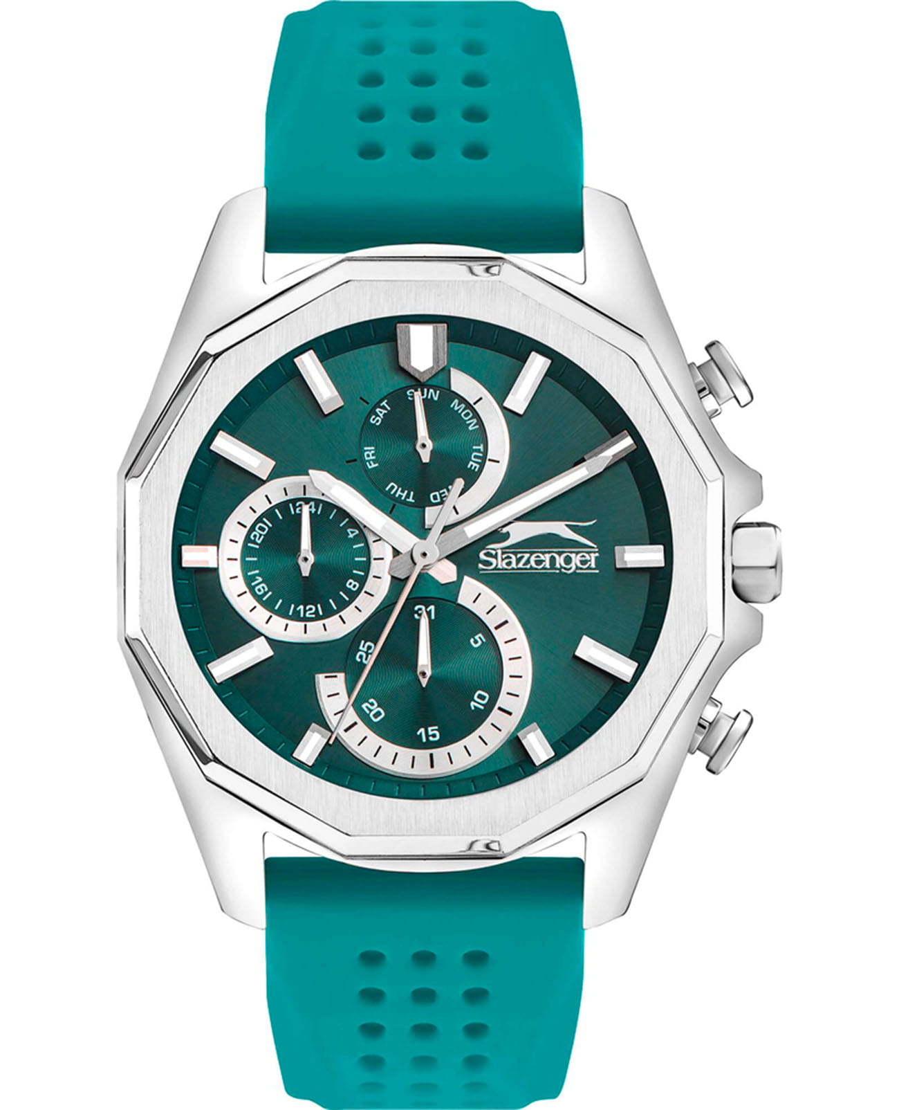 Мужские кварцевые часы Slazenger SL.09.2313.2.05 — это стильный и функциональный аксессуар, идеально дополняющий современный образ. Корпус выполнен из суперметалла. Циферблат оснащён минеральным стекломМинеральное стеклоМинеральное стекло представляет собой искусственно выращенный минерал кварца. Такое стекло отличается особой устойчивостью к повреждениям и царапинам. Уступает по некоторым качествам сапфировому стеклу. и оформлен с вынесенными малыми циферблатами для индикации дня недели, даты и времени в 24-часовом формате. Стрелки и метки оснащены люминесцентным покрытиемЛюминесцентное покрытиеПозволяет считывать показания времени в темноте. Производители наносят на стрелки, часовые индексы, безель или поверхность циферблата светонакопительный состав, дающий холодное свечение., обеспечивающим хорошую читаемость в темноте. Сатинированный безель и гранёная заводная головка с защитой придают модели выразительный внешний вид. Часы оснащены перфорированным силиконовым ремешком, фиксирующимся на классической пряжке. Водонепроницаемость 50 м позволяет использовать часы для плавания и повседневного ношения. Модель сочетает в себе прочность, комфорт и спортивный стиль.