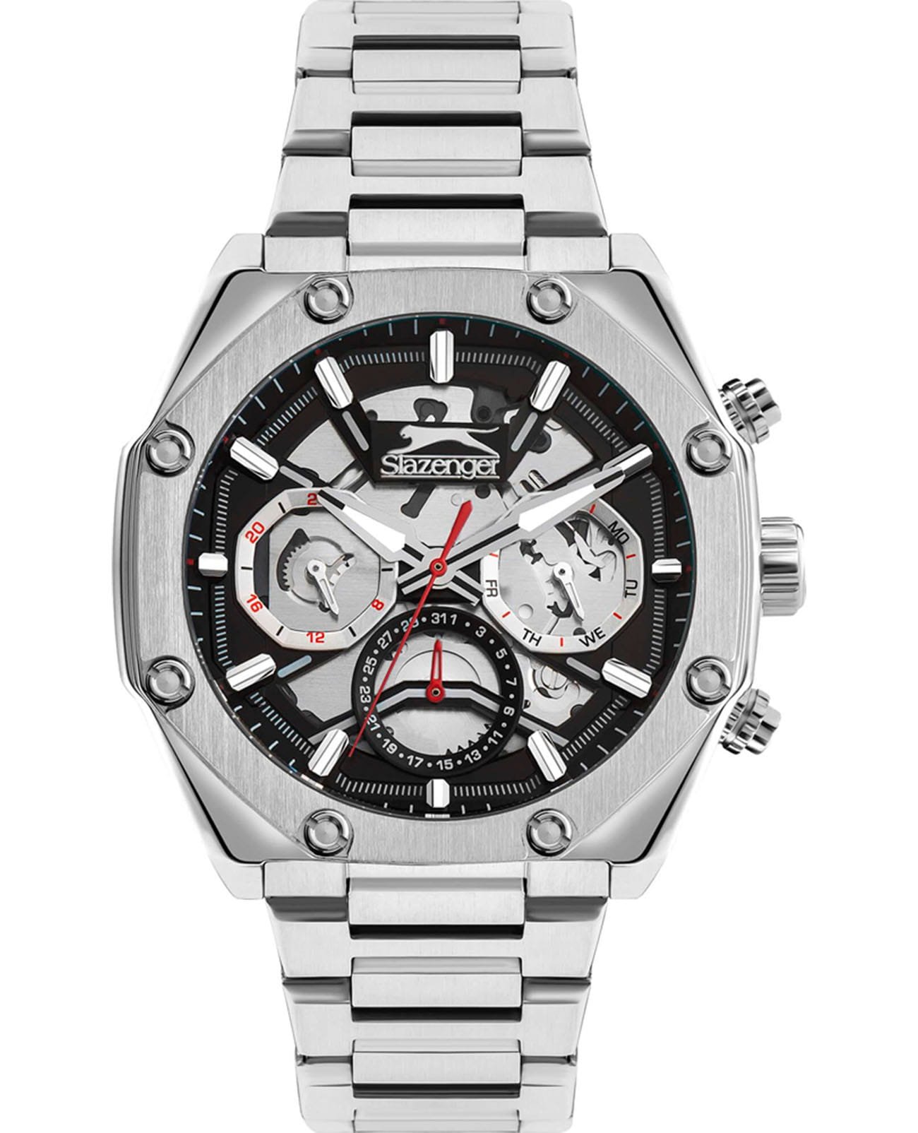 Мужские кварцевые часы Slazenger SL.09.2318.2.01 - это выразительный и функциональный аксессуар, сочетающий стиль, технологичность и насыщенную комплектацию. Корпус и браслет выполнены из суперметалла. Циферблат защищён минеральным стекломМинеральное стеклоМинеральное стекло представляет собой искусственно выращенный минерал кварца. Такое стекло отличается особой устойчивостью к повреждениям и царапинам. Уступает по некоторым качествам сапфировому стеклу. и частично скелетонизирован, что позволяет наблюдать за работой механизма, и дополнен вынесенными малыми циферблатами для индикации дня недели, даты и времени в 24-часовом формате. Стрелки и метки оснащены люминесцентным покрытиемЛюминесцентное покрытиеПозволяет считывать показания времени в темноте. Производители наносят на стрелки, часовые индексы, безель или поверхность циферблата светонакопительный состав, дающий холодное свечение., обеспечивающим хорошую читаемость в темноте. Браслет из суперметалла фиксируется на раскладной застёжкеРаскладная застёжкаТакой тип застёжки используется только на браслетах из металла. Она никогда не раскрывается полностью, происходит разделение на 2 и более частей. Раскладывающая застёжка снизит вероятность потери часов к минимуму., обеспечивая удобство и надёжность ношения. Водонепроницаемость 50 м позволяет использовать часы в повседневных условиях, защищая от случайных брызг и капель дождя. Модель подчёркивает индивидуальность владельца и идеально подходит как для повседневного, так и для делового образа.