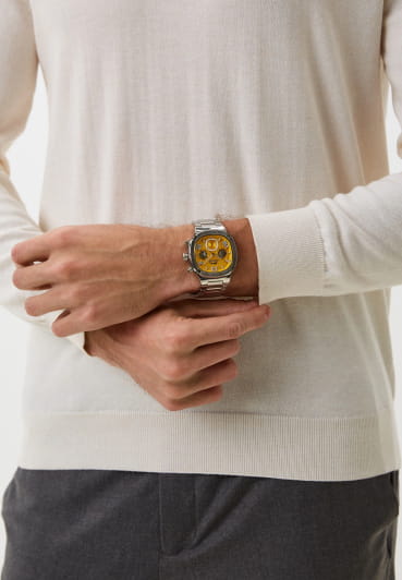 Мужские кварцевые часы Slazenger SL.09.2320.2.06 — это выразительный и функциональный аксессуар, сочетающий стиль, прочность и насыщенную комплектацию. Корпус и браслет выполнены из суперметалла, а циферблат частично оформлен в желтых тонах. Циферблат защищён минеральным стекломМинеральное стеклоМинеральное стекло представляет собой искусственно выращенный минерал кварца. Такое стекло отличается особой устойчивостью к повреждениям и царапинам. Уступает по некоторым качествам сапфировому стеклу. и дополнен вынесенными малыми циферблатами для индикации дня недели, даты и времени в 24-часовом формате. Стрелки и метки оснащены люминесцентным покрытиемЛюминесцентное покрытиеПозволяет считывать показания времени в темноте. Производители наносят на стрелки, часовые индексы, безель или поверхность циферблата светонакопительный состав, дающий холодное свечение., обеспечивающим хорошую читаемость в темноте. Браслет из суперметалла фиксируется на раскладной застёжкеРаскладная застёжкаТакой тип застёжки используется только на браслетах из металла. Она никогда не раскрывается полностью, происходит разделение на 2 и более частей. Раскладывающая застёжка снизит вероятность потери часов к минимуму., обеспечивая удобство и безопасность ношения. Водонепроницаемость 50 м позволяет использовать часы в повседневных условиях, защищая от случайных брызг и капель дождя. Модель подчёркивает индивидуальность владельца и идеально подходит как для повседневного, так и для делового образа.