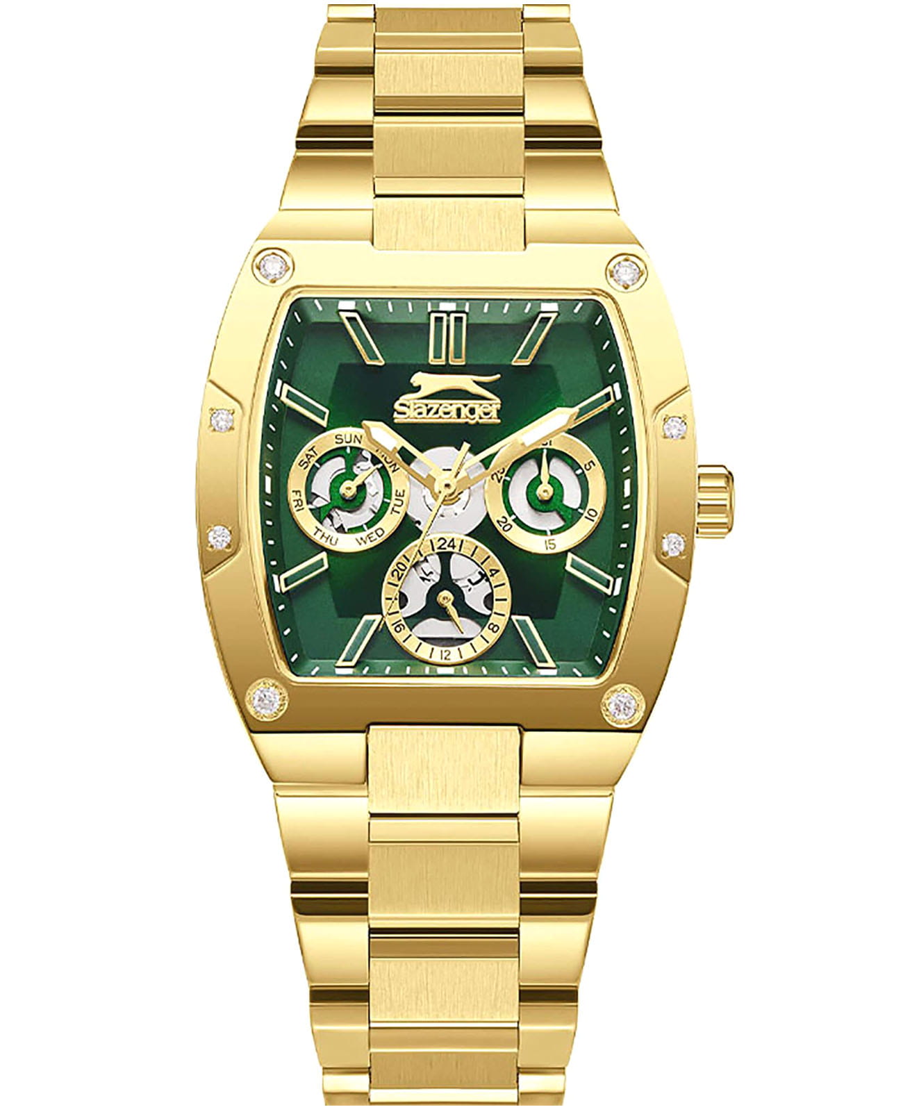 Женские кварцевые часы Slazenger SL.09.2357.4.05 – это сочетание элегантности, современного стиля и надёжности. Изящный корпус из суперметалла с IP-покрытиемIP-покрытиеМетод ионного напыления. Демонстрирует повышенную устойчивость к истиранию, окислению и химическим веществам. Под воздействием высокого давления и температуры около 1500°C молекулы металла надёжно соединяются с частицами корпуса часов. золотистого цвета, размером 32 мм х 33 мм и толщиной 10 мм, подчёркивает утончённость модели и делает их идеальным аксессуаром для любой ситуации – будь то деловая встреча, романтический вечер или повседневные выходы. Циферблат надёжно защищён минеральным стекломМинеральное стеклоМинеральное стекло представляет собой искусственно выращенный минерал кварца. Такое стекло отличается особой устойчивостью к повреждениям и царапинам. Уступает по некоторым качествам сапфировому стеклу., которое устойчиво к механическим повреждениям и сохраняет кристальную прозрачность. Браслет из суперметалла с IP-покрытиемIP-покрытиеМетод ионного напыления. Демонстрирует повышенную устойчивость к истиранию, окислению и химическим веществам. Под воздействием высокого давления и температуры около 1500°C молекулы металла надёжно соединяются с частицами корпуса часов. удобно облегает запястье и фиксируется с помощью раскладной застёжкиРаскладная застёжкаТакой тип застёжки используется только на браслетах из металла. Она никогда не раскрывается полностью, происходит разделение на 2 и более частей. Раскладывающая застёжка снизит вероятность потери часов к минимуму., обеспечивая надёжность и комфорт в повседневном ношении. Утончённый стиль, внимание к деталям и практичность делают эту модель идеальным выбором для современных женщин, ценящих эстетику и функциональность. Стрелки и метки покрыты люминесцентным покрытиемЛюминесцентное покрытиеПозволяет считывать показания времени в темноте. Производители наносят на стрелки, часовые индексы, безель или поверхность циферблата светонакопительный состав, дающий холодное свечение., обеспечивающим отличную читаемость в темноте. Вынесенный циферблат с 24-х часовым указателем времени. Водозащита до 30 метров позволит защитить корпус от случайных брызг или капель дождя.