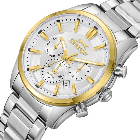 Мужские кварцевые часы Slazenger — это выразительный и функциональный аксессуар. Корпус диаметром 43 мм и толщиной 12 мм выполнен из нержавеющей стали 316L. Циферблат серебристого цвета оформлен индексами и стрелками с люминесцентным покрытиемЛюминесцентное покрытиеПозволяет считывать показания времени в темноте. Производители наносят на стрелки, часовые индексы, безель или поверхность циферблата светонакопительный состав, дающий холодное свечение., обеспечивающим хорошую читаемость в темноте. БезельБезельВнешний ободок, закрепляющий стекло. В спортивных часах так называется поворотное кольцо с делениями на циферблате, выполняет роль таймера – замеряет отрезки времени на шкале. Неподвижный безель – элемент декора. Однонаправленно вращающийся безель на дайверских часах позволяет фиксировать моменты погружения и выныривания на поверхность. из нержавеющей стали с PVD-покрытиемPVDУльтратонкое покрытие наносится в технике вакуумного напыления, сочетает в себе нитрид титана особой прочности со слоем золота или оксида хрома. Несёт в себе декоративную или защитную функцию.. Циферблат защищён минеральным стекломМинеральное стеклоМинеральное стекло представляет собой искусственно выращенный минерал кварца. Такое стекло отличается особой устойчивостью к повреждениям и царапинам. Уступает по некоторым качествам сапфировому стеклу.. Механизм — кварцевый калибр JP25. Часы оснащены индикацией дня недели, даты, 12/24-часового формата времени и функцией второго часового пояса (GMT)Второй часовой поясФункция, позволяющая отображать время двух часовых поясов одновременно.. Окошко даты расположено между 4 и 5 часами. Часы оснащены стальным браслетом из нержавеющей стали 316L с раскладной застёжкойРаскладная застёжкаТакой тип застёжки используется только на браслетах из металла. Она никогда не раскрывается полностью, происходит разделение на 2 и более частей. Раскладывающая застёжка снизит вероятность потери часов к минимуму.. Водонепроницаемость 100 м позволяет использовать часы для плавания и повседневного ношения. Гарантия — 12 месяцев. Идеальный выбор для тех, кто ценит стиль, функциональность и качество.