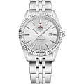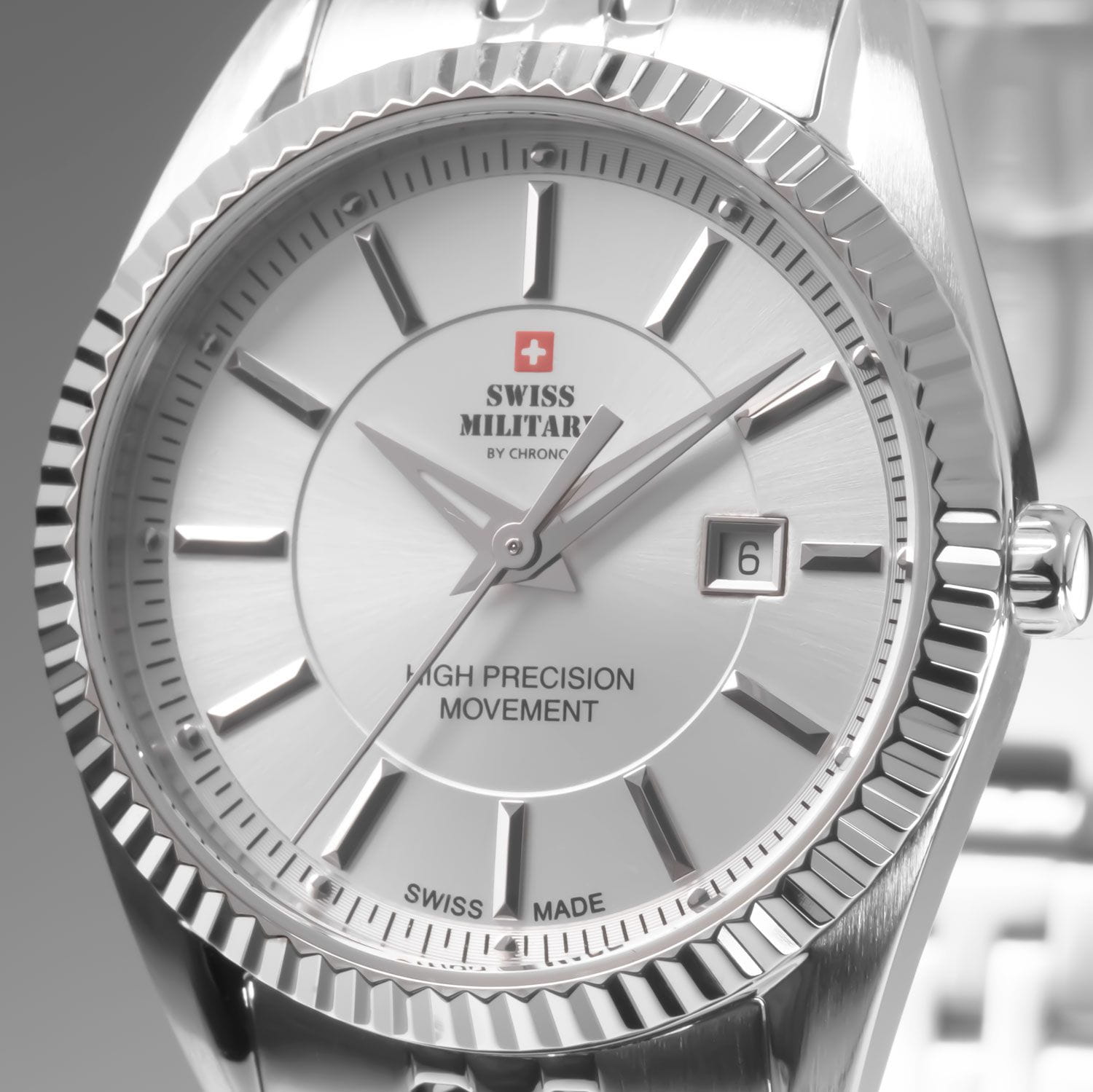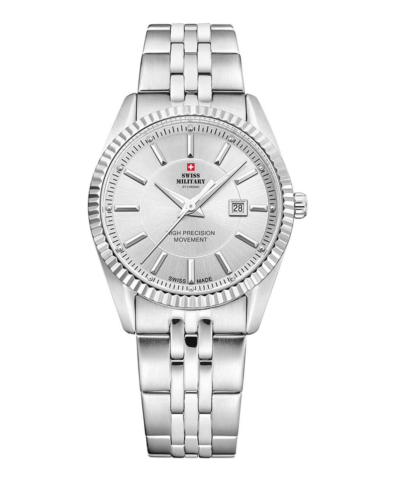 Часы Swiss Military SM34066.02 — это изысканный женский аксессуар, объединяющий элегантность и швейцарскую точность. Корпус диаметром 30 мм и браслет выполнены из нержавеющей стали, что придаёт часам стильный и долговечный характер. Серебристый циферблат с классическими индексами и стрелками защищён минеральным стеклом с сапфировым покрытиемСапфировое стеклоПрочный и надёжный материал из кристалла сапфира синтетического происхождения, характеризующийся особой твёрдостью и устойчивостью к царапинам и повреждениям., устойчивым к царапинам.