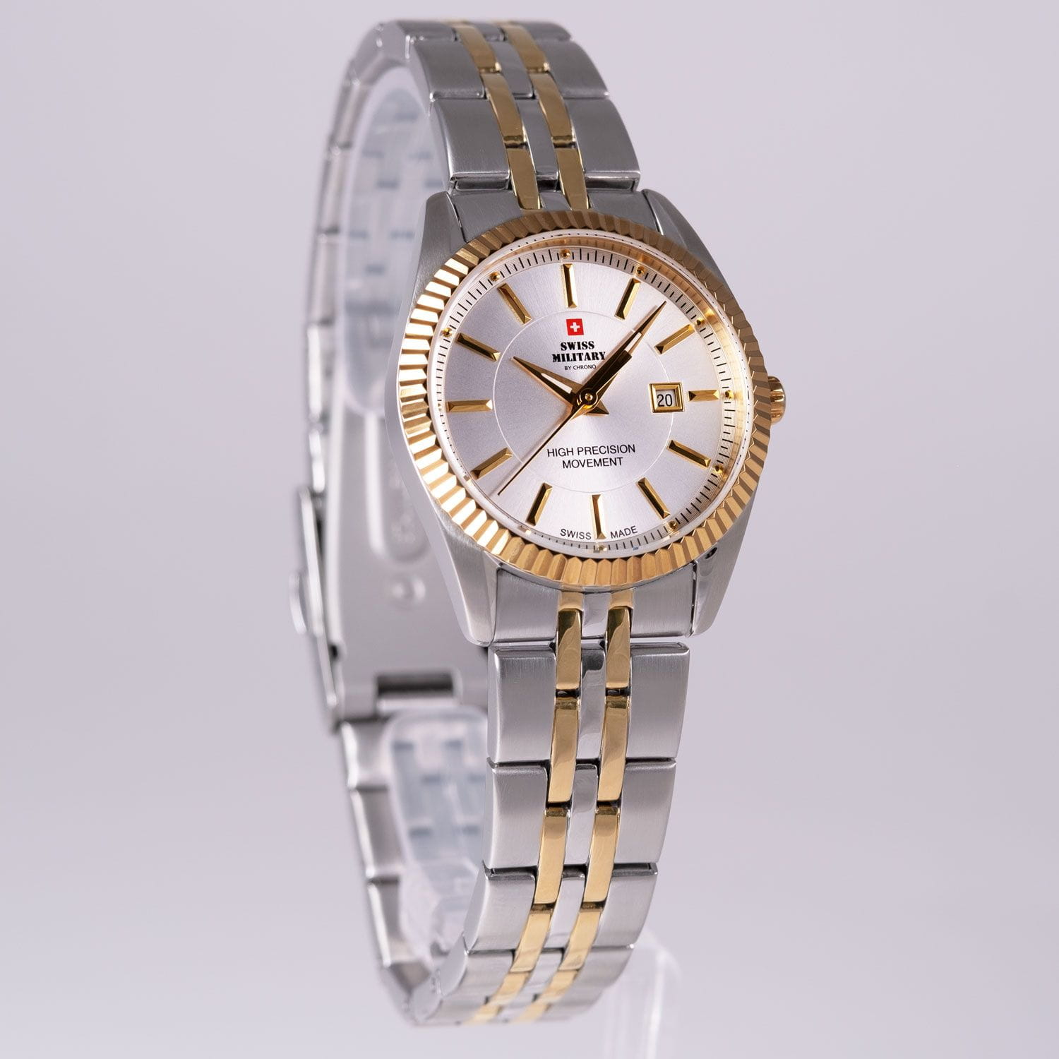 Женские швейцарские наручные часы Swiss Military by Chrono SM34066.05, кварцевый механизм с высокой точностью. Минеральное стеклоМинеральное стеклоМинеральное стекло представляет собой искусственно выращенный минерал кварца. Такое стекло отличается особой устойчивостью к повреждениям и царапинам. Уступает по некоторым качествам сапфировому стеклу. устойчивое к появлению царапин, обладающее высокой прозрачностью. Класс водозащиты: 50 метров, позволит защитить корпус от случайных брызг или капель дождя. Корпус часов изготовлен из стали.БезельБезельВнешний ободок, закрепляющий стекло. В спортивных часах так называется поворотное кольцо с делениями на циферблате, выполняет роль таймера – замеряет отрезки времени на шкале. Неподвижный безель – элемент декора. Однонаправленно вращающийся безель на дайверских часах позволяет фиксировать моменты погружения и выныривания на поверхность. с PVD-покрытиемPVDУльтратонкое покрытие наносится в технике вакуумного напыления, сочетает в себе нитрид титана особой прочности со слоем золота или оксида хрома. Несёт в себе декоративную или защитную функцию.. Браслет с раскладной застёжкойРаскладная застёжкаТакой тип застёжки используется только на браслетах из металла. Она никогда не раскрывается полностью, происходит разделение на 2 и более частей. Раскладывающая застёжка снизит вероятность потери часов к минимуму. и с частичным PVD-покрытиемPVDУльтратонкое покрытие наносится в технике вакуумного напыления, сочетает в себе нитрид титана особой прочности со слоем золота или оксида хрома. Несёт в себе декоративную или защитную функцию..